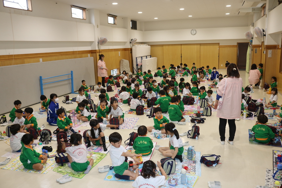 体育館で年長年少さん一緒にお弁当