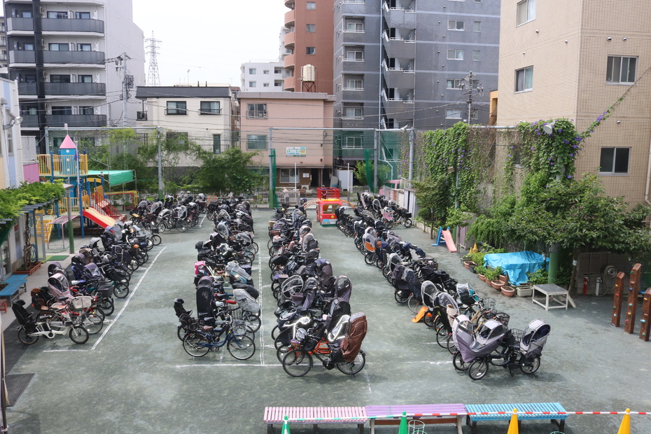 園庭に自転車がいっぱいです。