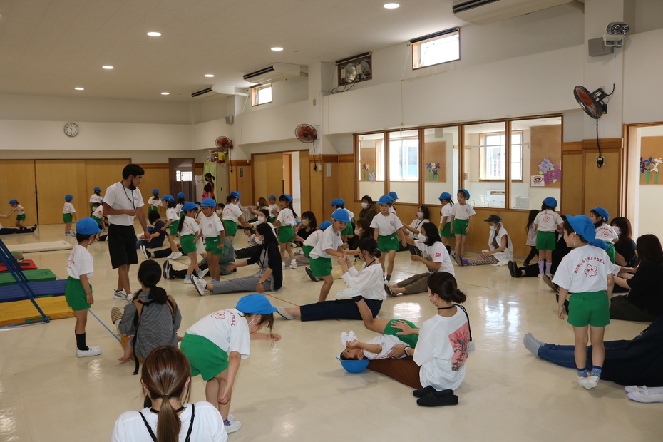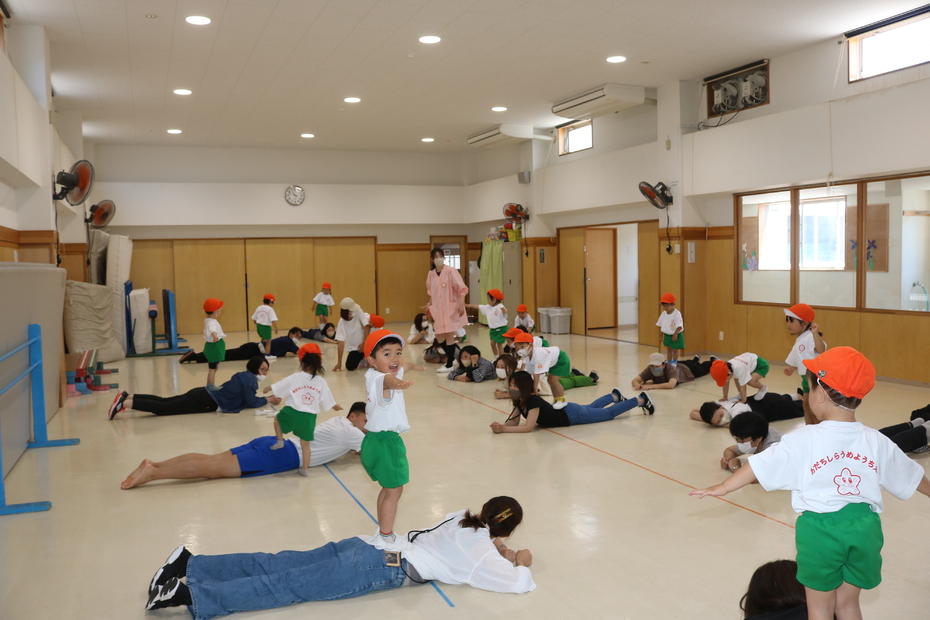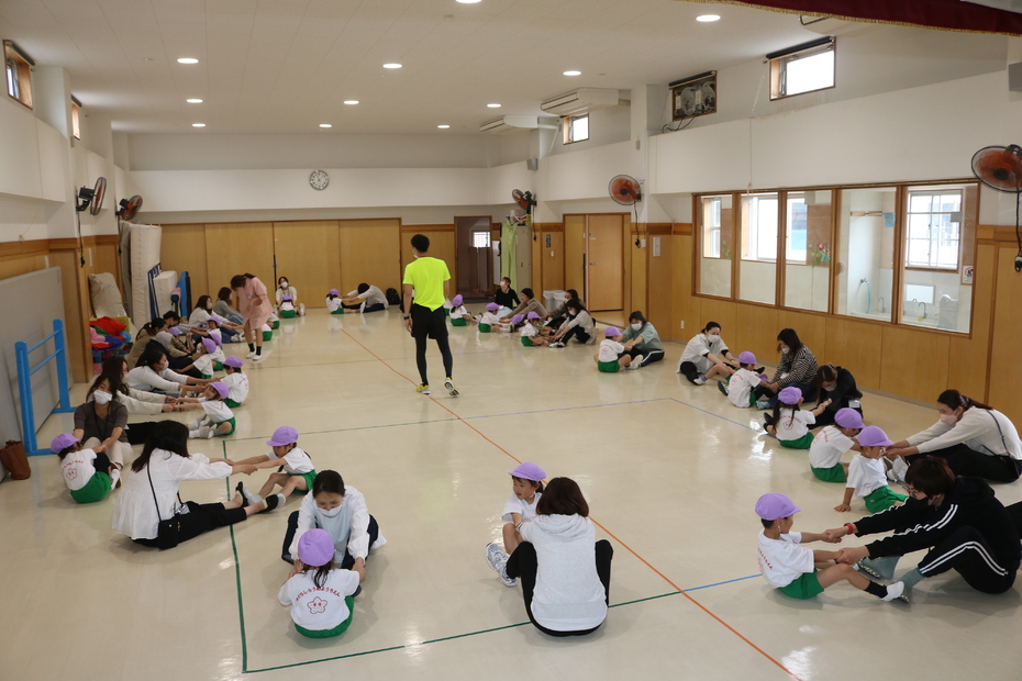体育館で保護者の方と一緒に体操をしました。