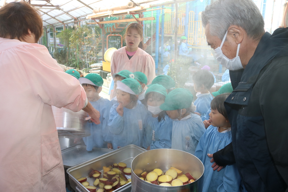 年中組のお友達が持ってきてくれたお芋を蒸籠で蒸かしみんなでいただきました