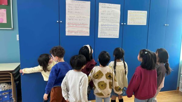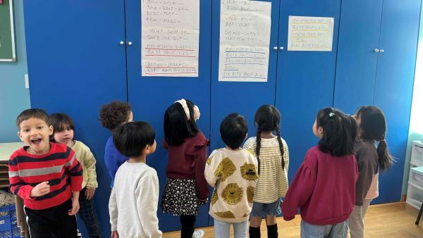 壁に貼ってある歌詞を見て歌の練習をしています。