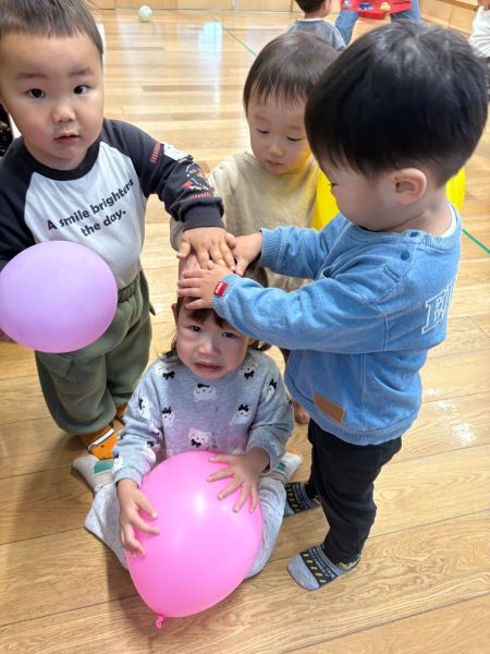 泣いているお友達がいるとみんなどーしたのと近くに来て頭を撫でてくれたり優しいところもたくさん見られます。
