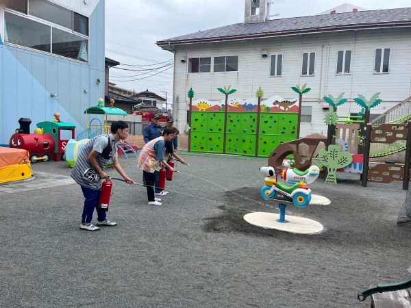 先生方の消火訓練も行い、子供たちは真剣に見ていました。