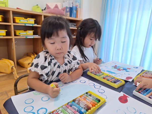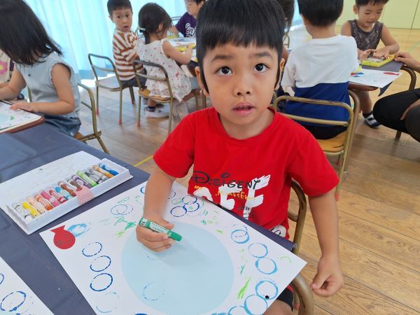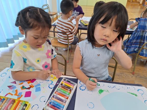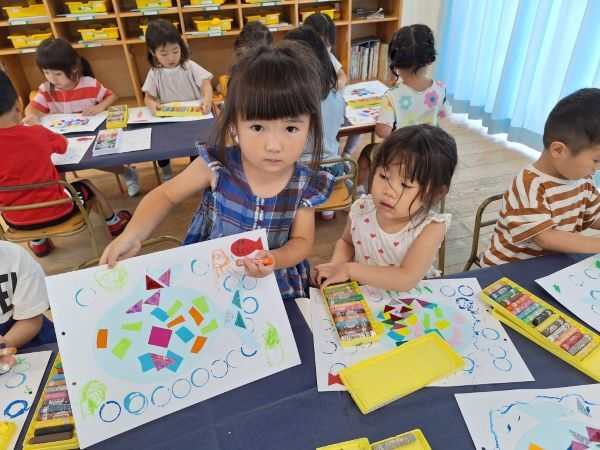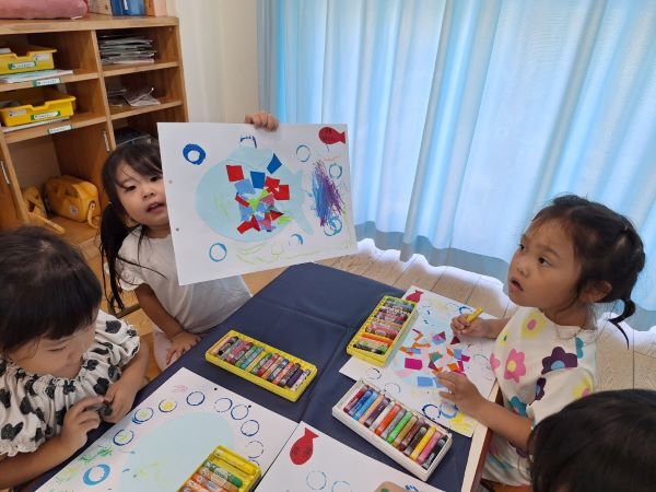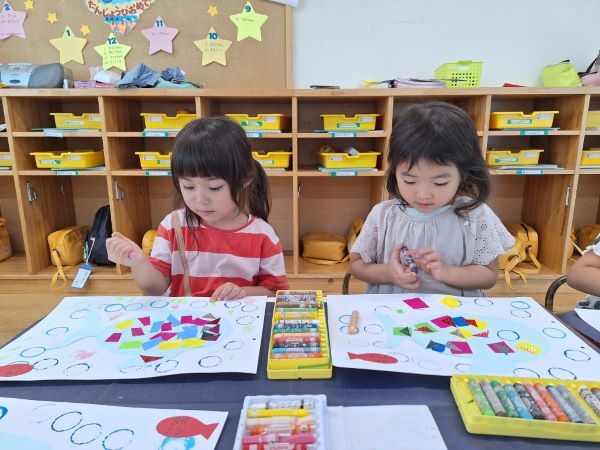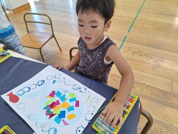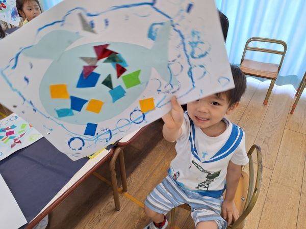 8月の製作は、にじいろのさかなを作りました。折り紙をはさみで1回切り!はさみを使うのが楽しいようです。