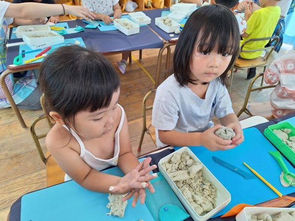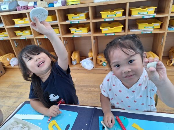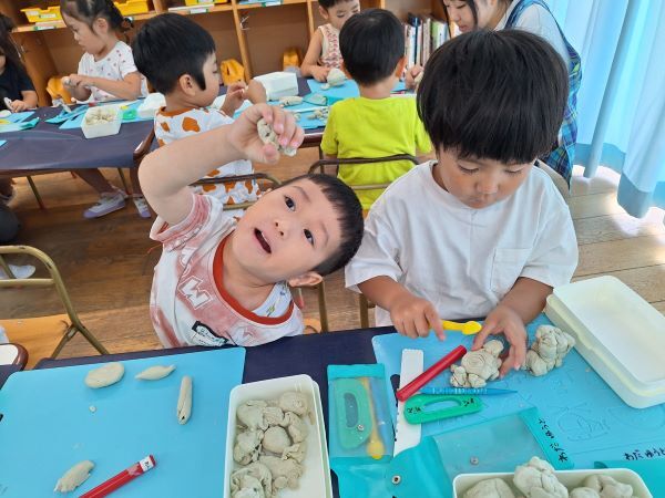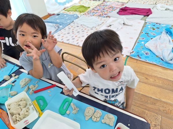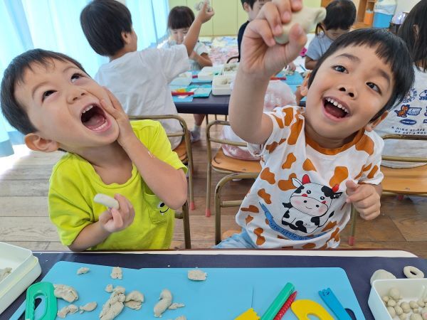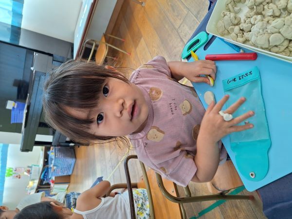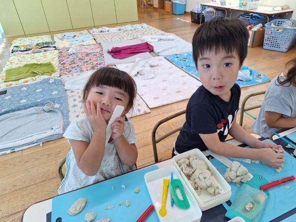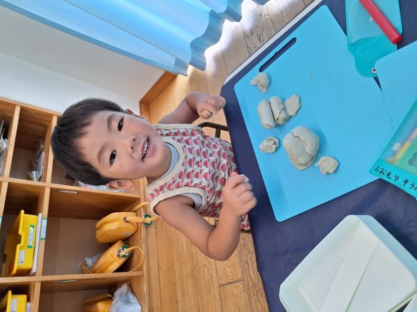 みんなだいすきな粘土遊び!へびや指輪を作ったり、作ってぇと保育者に作ってもらったりと楽しく過ごしています。