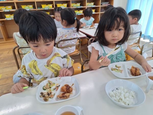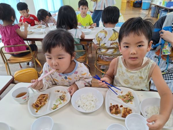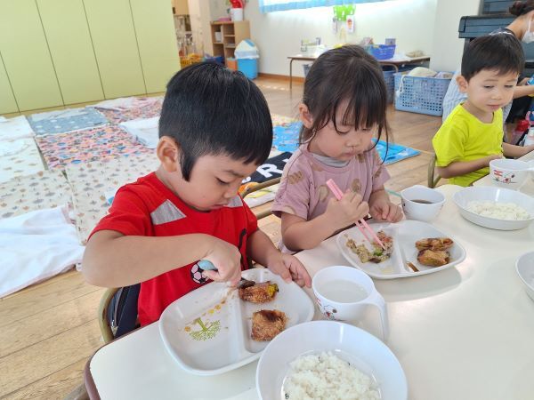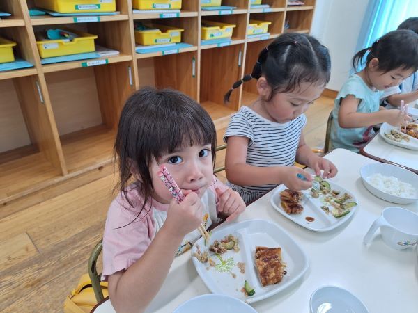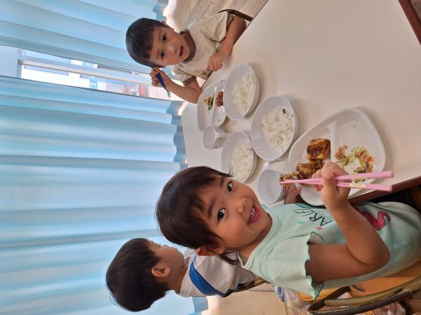 楽しく遊んだ後は美味しい給食!最近は、お箸を使いたいと頑張って食べているお友だちも増えてきました。まだ、しっかりとつかめず…時には手で食べてしまうこともあります。おうちでおはしの使い方を教えてください!