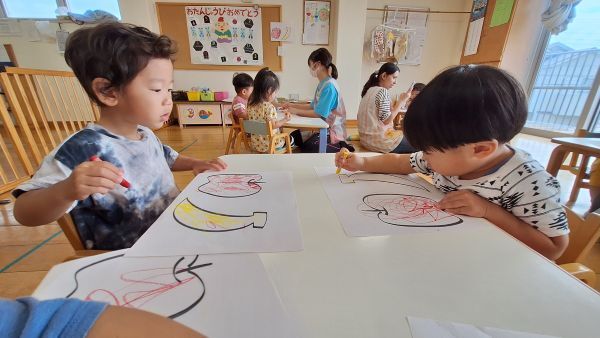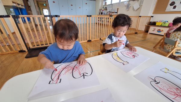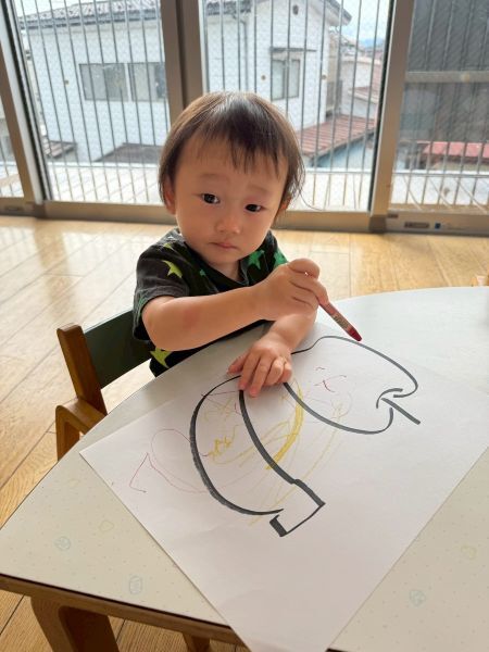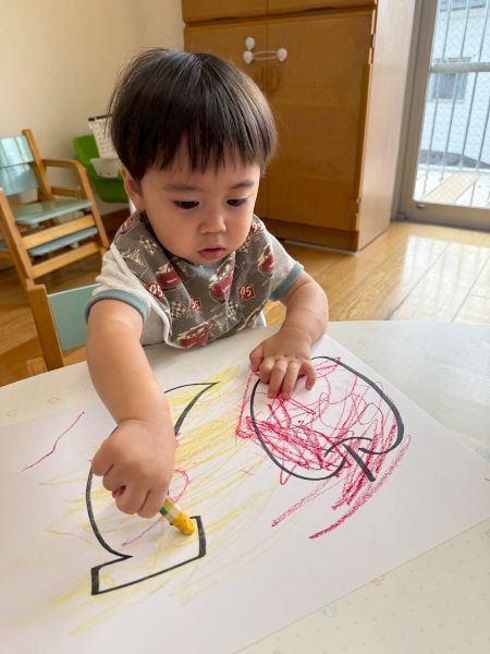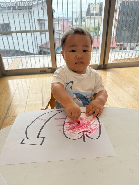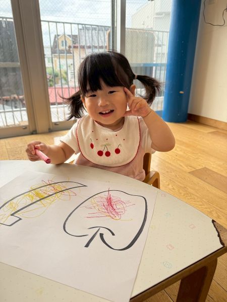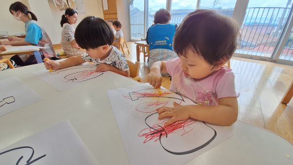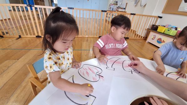 みんなの前で絵を描くとりんご、バナナと答えてくれたり、何人かはりんごは赤、バナナは黄色とわかっていて楽しそうに塗ってくれました。