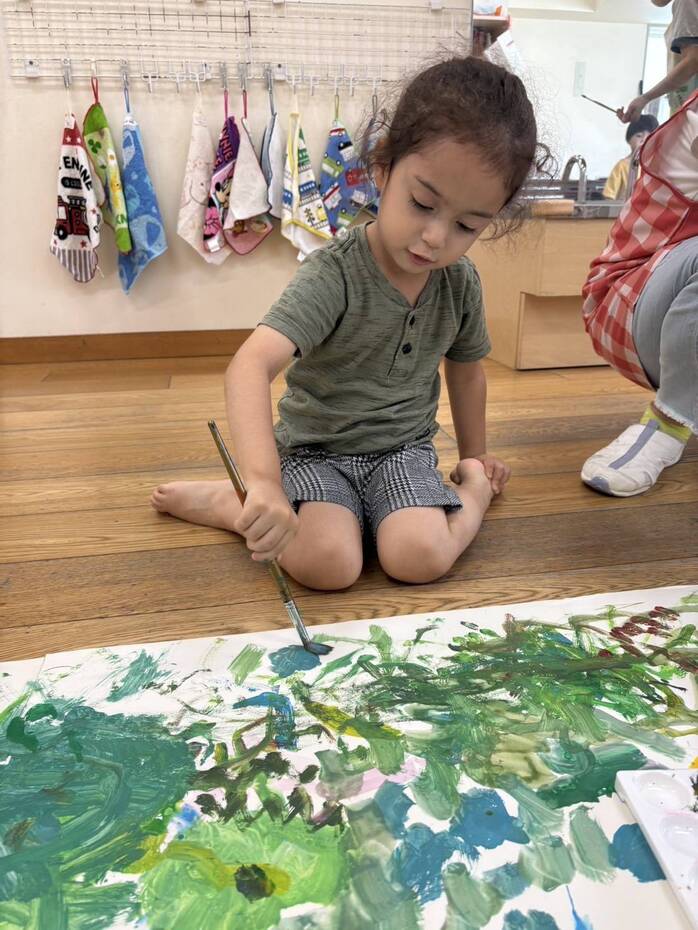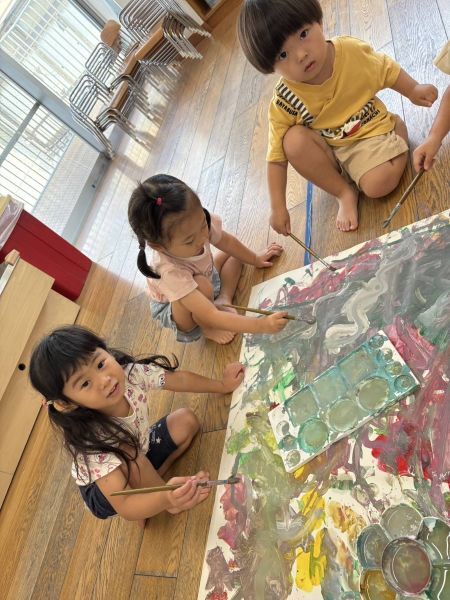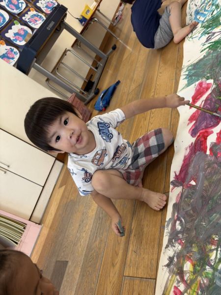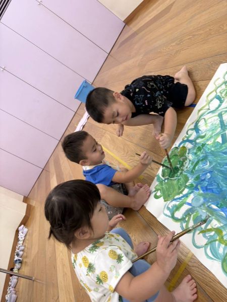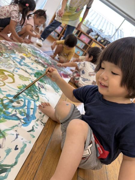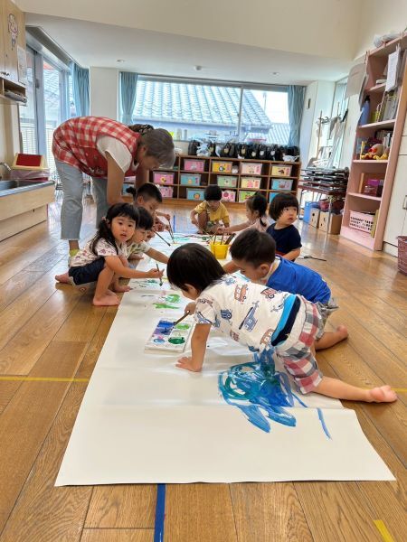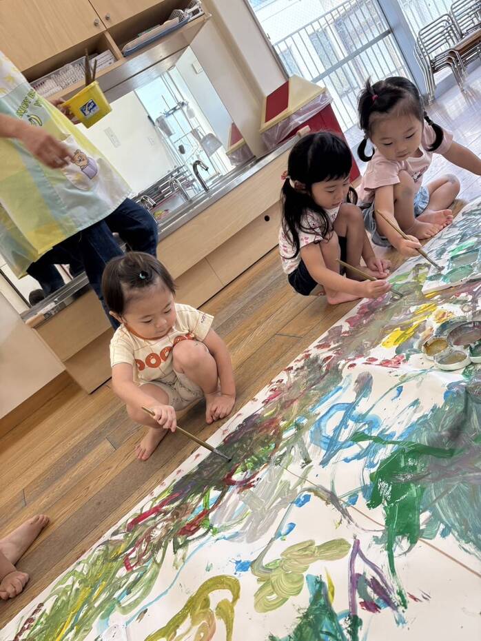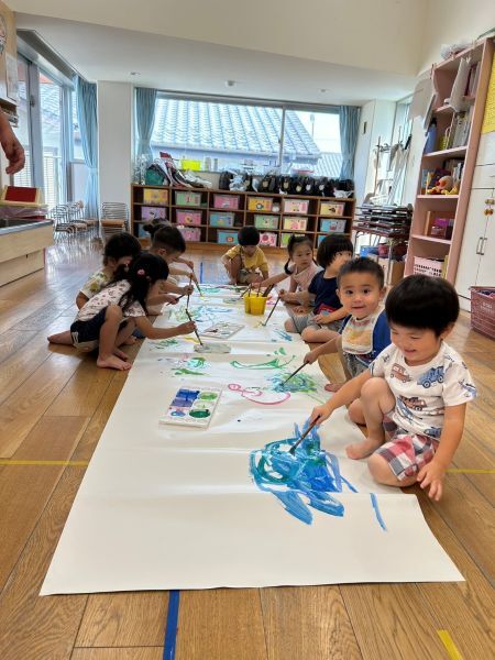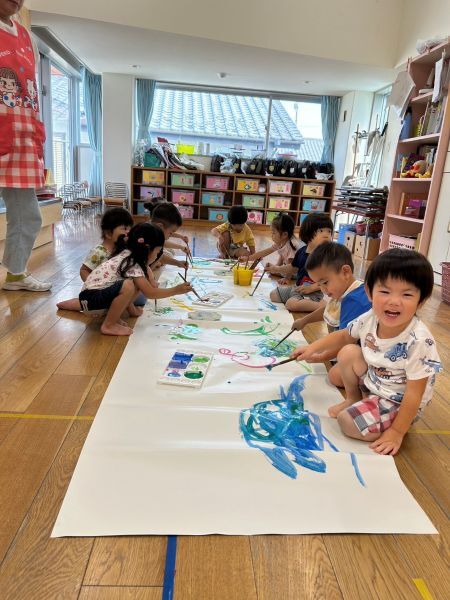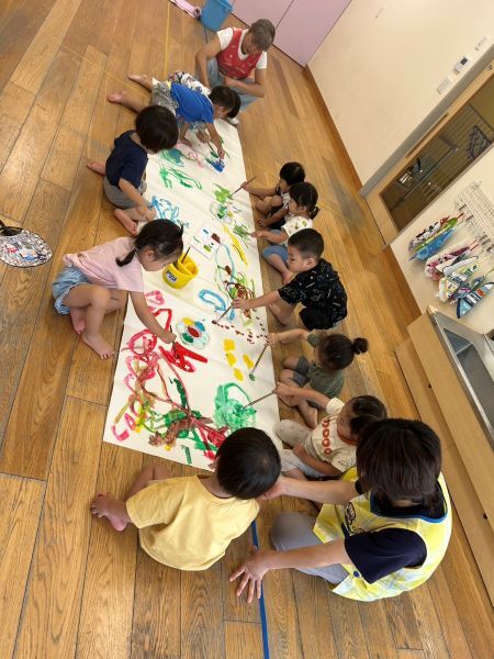 今日は大きな模造紙に絵の具でお絵かきをしました。