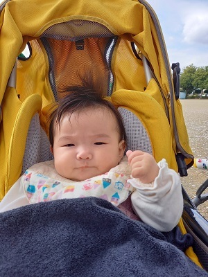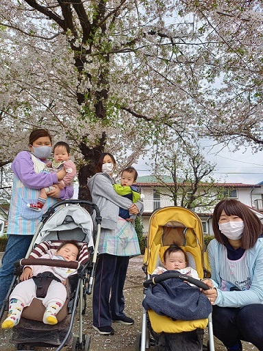 すぐに慣れて遊び出すお友達やまだ慣れてなくて泣いているお友達もいますが、お外に出ると気持ちよくてお昼寝してしまったり、周りの様子を見て楽しんでいる姿が見られます!