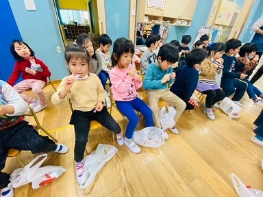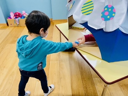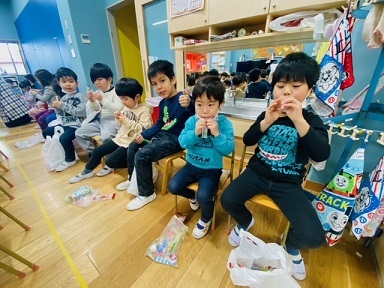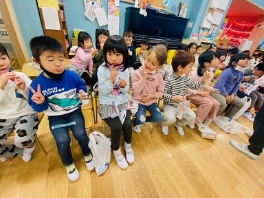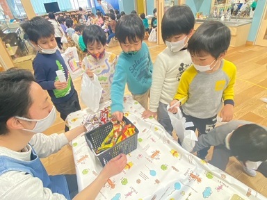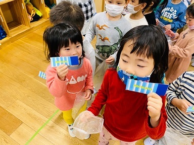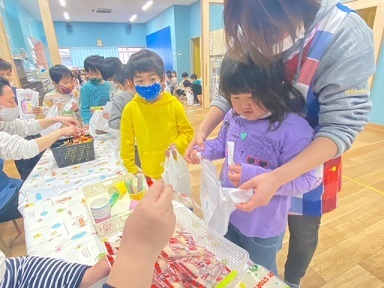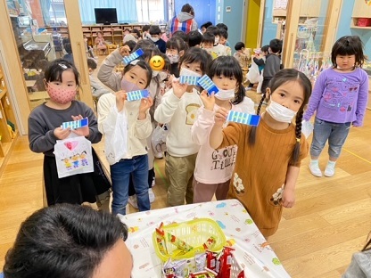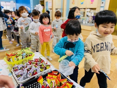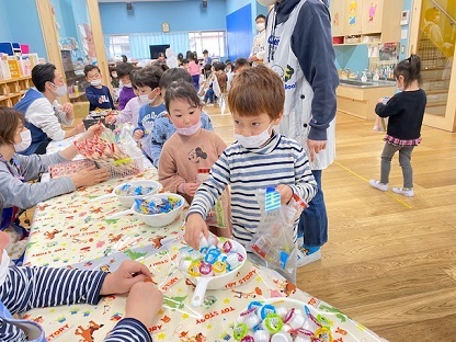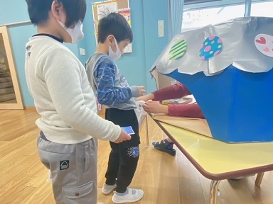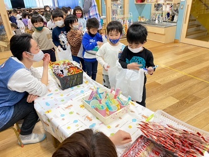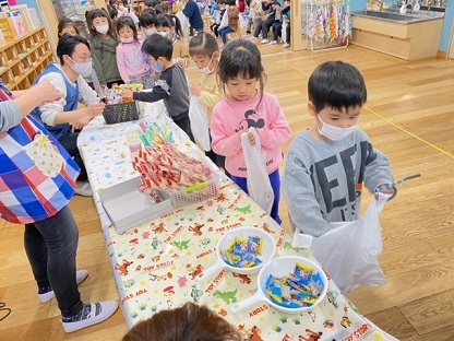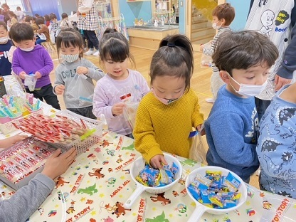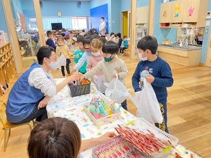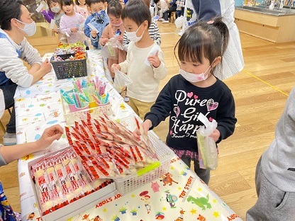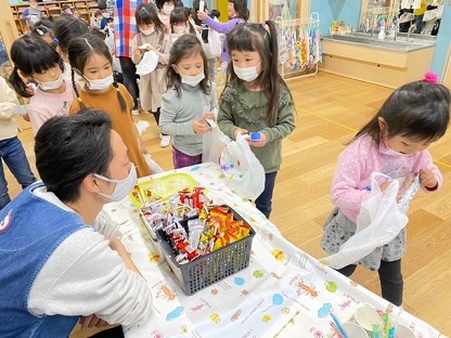 | 2月26日(金)はと、うさぎ、ひつじ組合同でお店屋さんごっこを行いました! お買い物券を持って、買いに行くのは本物のおやつ!! | ||