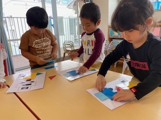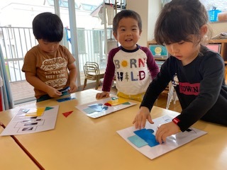 丸、三角、四角を頭を使って上手にはめて完成!! | ||