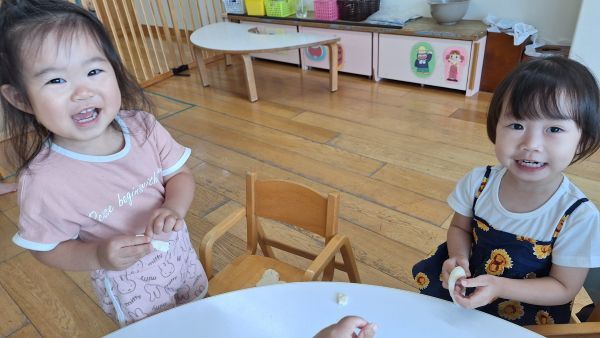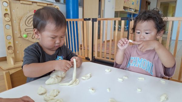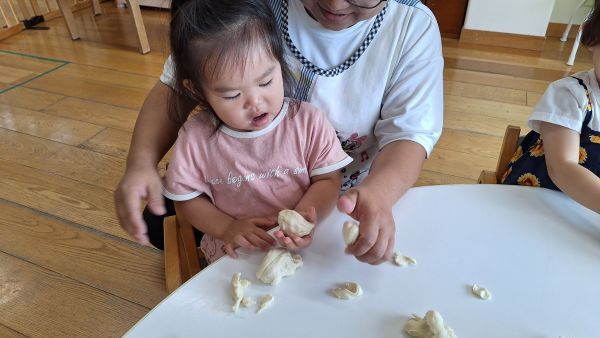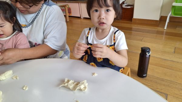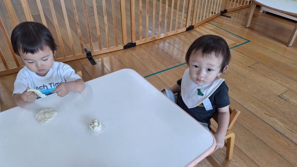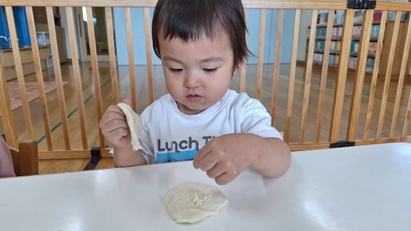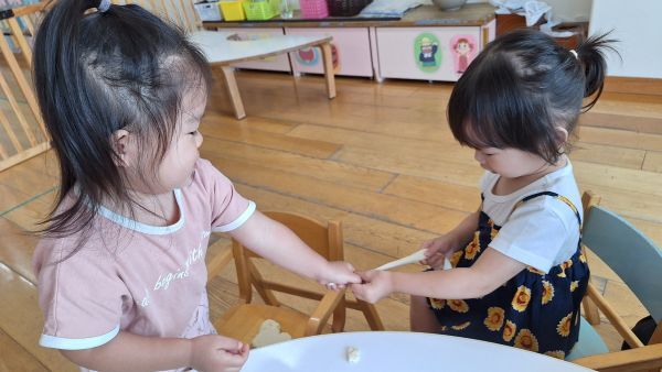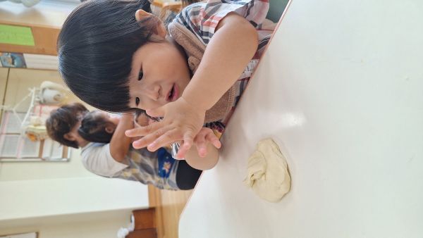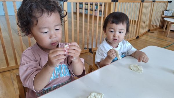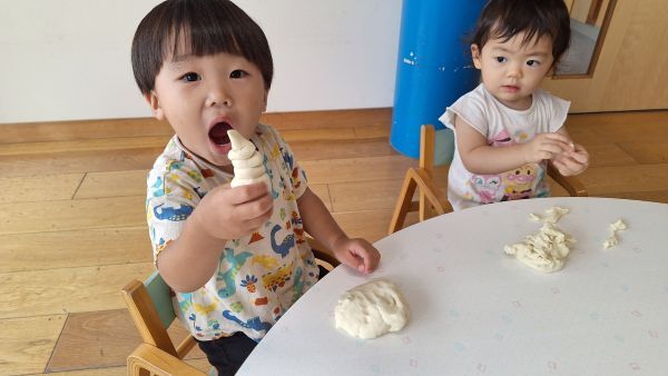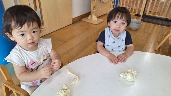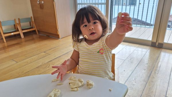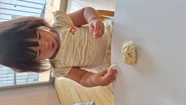 粘土遊びを繰り返して行ううちに触るのが苦手だった子供も慣れてきて引っ張ったりちぎったりする姿が見られます。保育士が作ったアンパンマンを真似したり、お友達と一緒に引っ張ったりあったりと楽しんでいます。物を作る喜び、うれしさを共有できるこの時間を大切にしたいと思います。