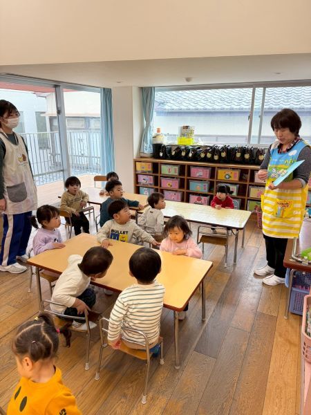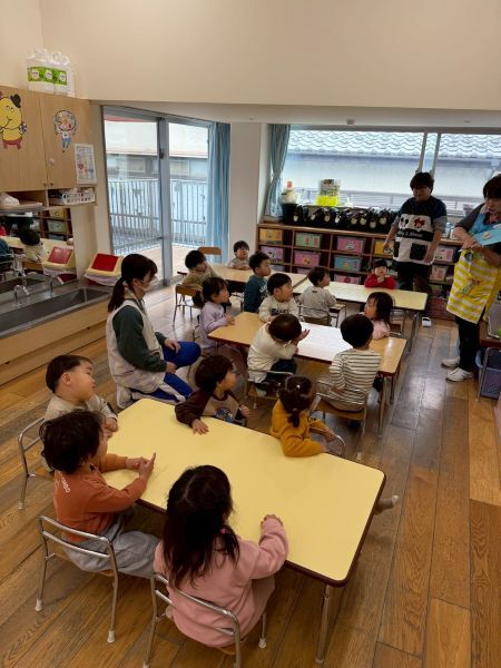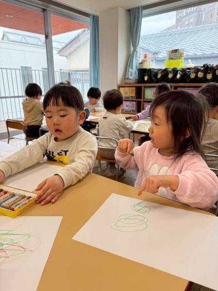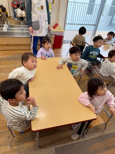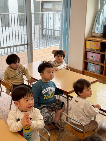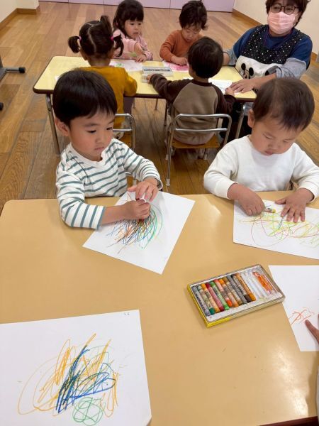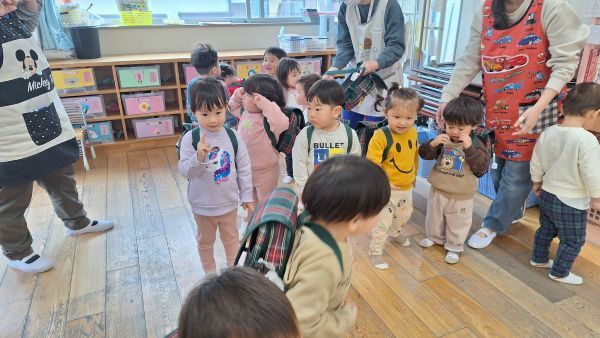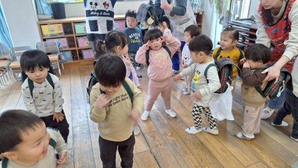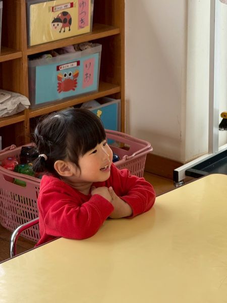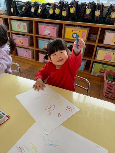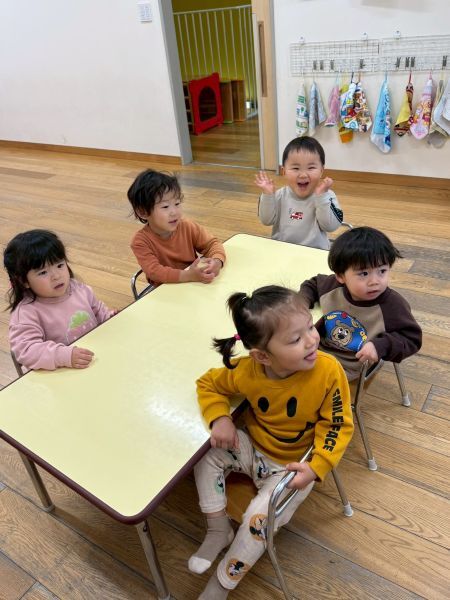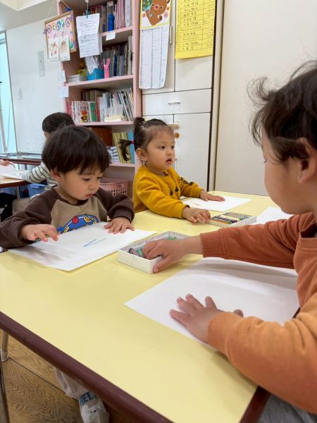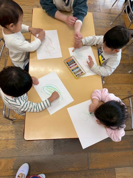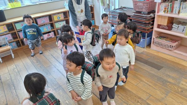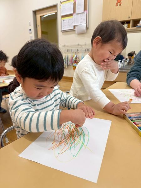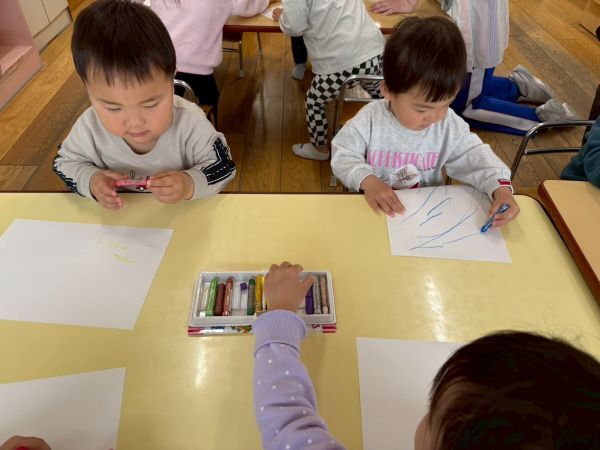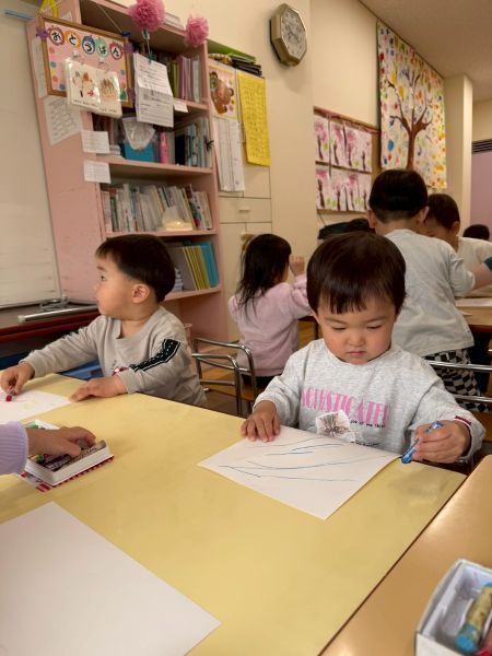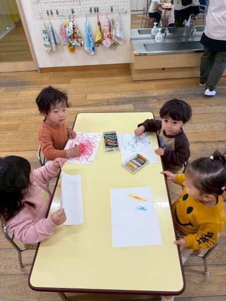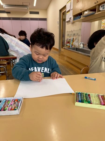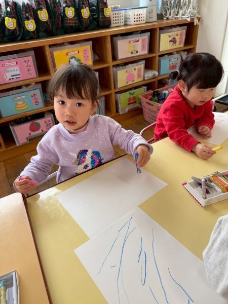 ひよこぐみもあと少しで終わり、もうすぐ1つ大きいクラスりす組さんに進級です!今日はりすぐみさんのお部屋を探険、リュックを背負わせてもらったり、これからは自分のクレヨン、粘土セットを使うことを話すとやりたいという声が聞こえ大きな机、椅子に座ってお絵描きを楽しみました。