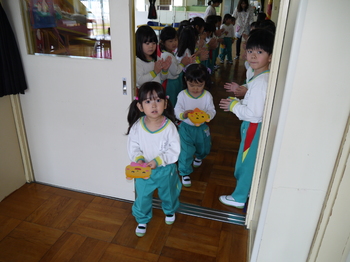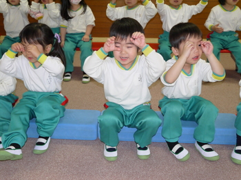 初めて全園児がホールに集まり、新入園児歓迎会が行わ れました。新入園児達も少しずつ慣れてきて笑顔が見られ るようになり、何が始まるのかドキドキワクワクしながら ひまわり組に並び開始を待っていました。入場の音楽が流 れると年長のお友達に手を引かれ入場し、ステージのベン チに座って歓迎会が始まりました。 歓迎会では“パンダうさぎコアラ”の手遊びを楽しんだ り、進級児から、これまでたくさん練習を積んできた“歓 迎の言葉”と『園歌』、軽やかな鈴に合わせながらの『手 のひらを太陽に』の歌のプレゼントがあり、和やかな雰囲 気の中で行われました。 退場時には大きな拍手と年長からのメッセージの入った プレゼントが送られると、とても嬉しそうに笑顔を見せる 新入園児達。たくさんのお友達に囲まれ、楽しい歓迎会に なりました。 | ||