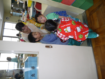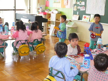 お片付けが近づくと来園してくるお父さんお母さんの姿 に「おうちの人が来たよ~!」と嬉しそうな表情を見せる 子ども達。たくさんの新入園児の保護者の方々にご参加い ただき、給食参観が行われました。 片付けが終わると排泄をしてしっかり手を洗い、暖かく 見守られる中で頑張って昼食の支度を行った後、お当番さ んが自分のグループのお友達に給食を配ります。少し緊張 しながらも大きな声で「いただきます」のご挨拶をして昼 食が始まりました。 蓋が閉まらなくくらいたくさん入った栄養満点の給食。 お箸やフォークを使ってもりもり食べる子ども達。お母さ ん方が帰った後には寂しがる様子も見せましたが、食後の おやつのゼリーまで美味しく頂きました。 | ||