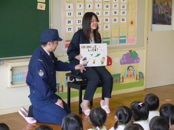 芦別警察署野花南駐在所のおおもとさんが 子ども達に分かりやすく防犯を伝えることができる 紙芝居『いかのおすし』を作成し、 幼稚園で読み聞かせをしてくださいました! 「不審者と会った時にはどうしたらいいのか‥」 わかりやすい絵とお話に子ども達も集中し、 すごく真剣に見ていました。とても良いお勉強になりました。 どうもありがとうございました! | ||