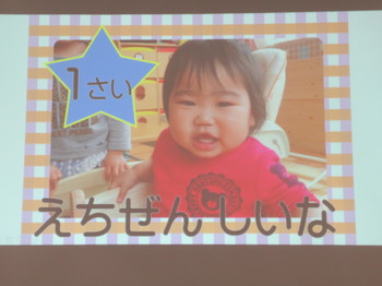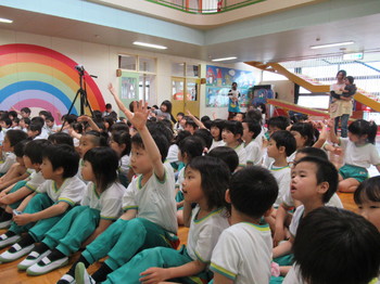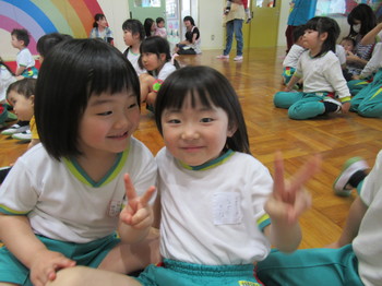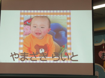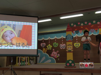 今年度2回目のお誕生会が行われました。5月にオープンしたばかりのリリー保育園から小さいお友達がやってきて、初めて行う合同でのお誕生会。小さくて可愛らしいリリーのちびっ子達にうっとりする子の姿も見られ、年少・満3歳児クラスのお友達もちょっぴり先輩気分を味わっているように見えました。会がはじまり、入場門をくぐり抜けステージ上へ向かう子ども達の表情は喜びに満ち溢れ“お誕生日は特別な日”そんな思いが伝わってくるようでした。スクリーンに映る生まれた頃の写真を交えての自己紹介・歌やお誕生日カードのプレゼント・お楽しみ会のパネルシアターなど、楽しい時間はあっという間に過ぎていきました。この日の喜びを胸に、これからもより大きく成長していくことを願っています! | ||
