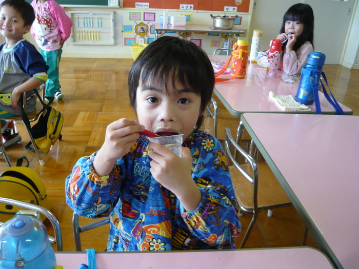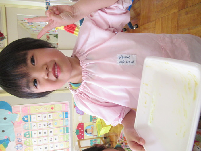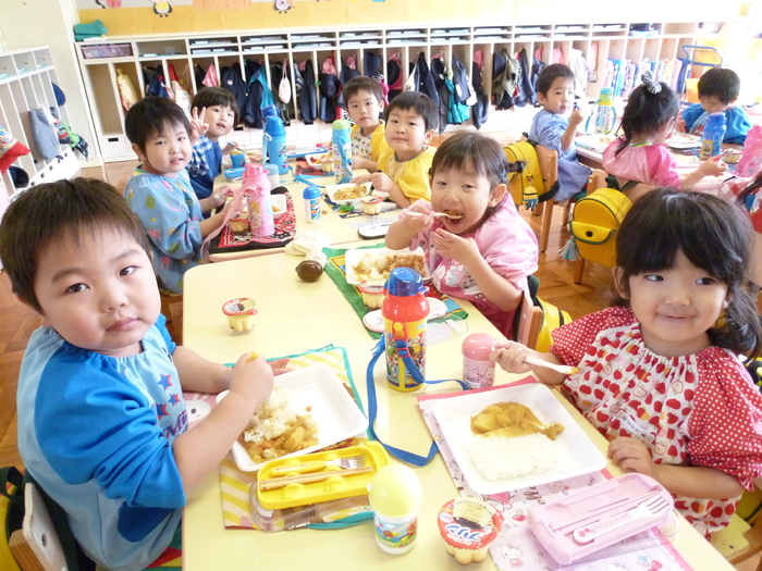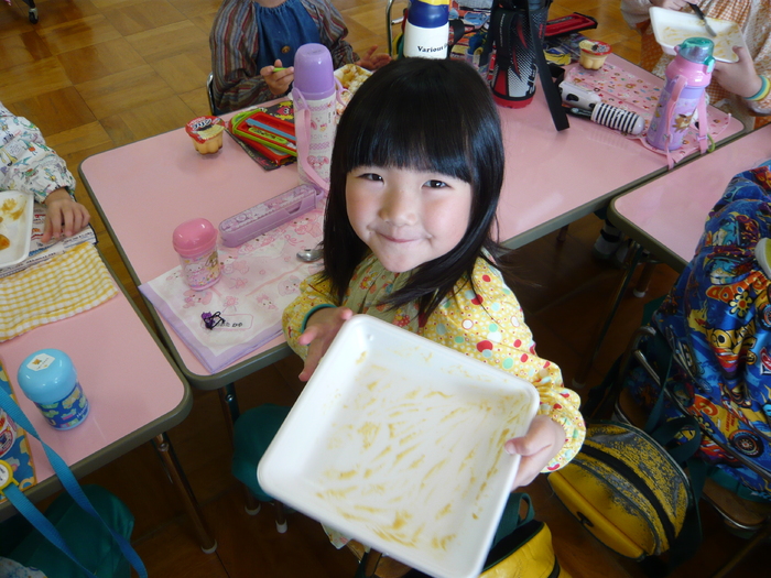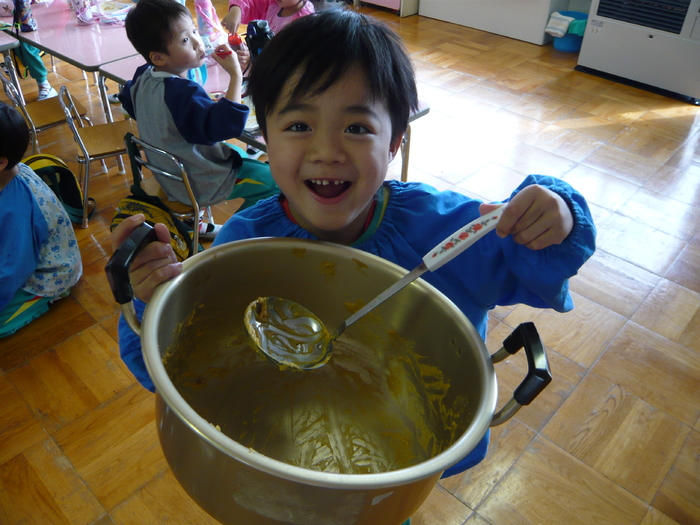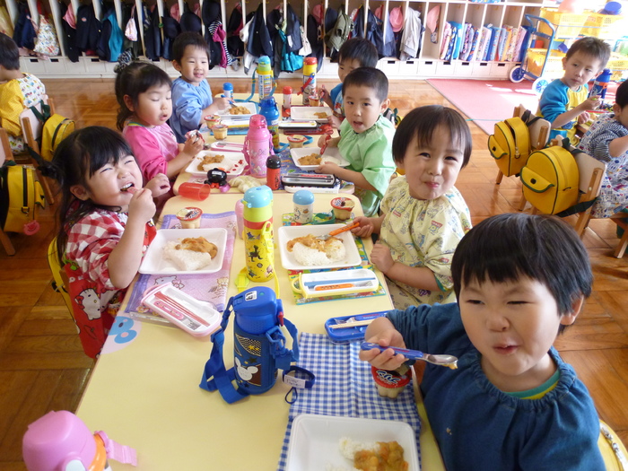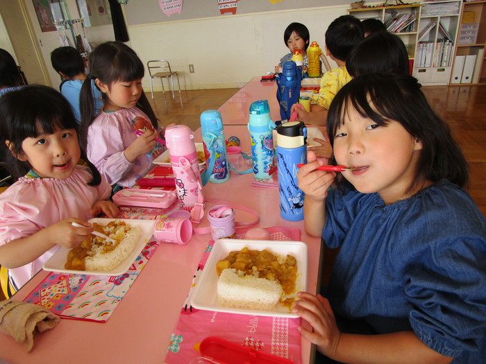 年長さんが畑で育てたジャガイモを使って、カレーを作り昼食時にみんなで美味しくいただきました!年長さんは、ジャガイモや人参の皮をむくお仕事をしました。ピーラーを上手に使いジャガイモの芽を取ったり一つ一つ丁寧に皮をむいたりと頑張ってくれました。お昼近くになると、ホールにカレーのいい匂いが…「早く食べたいなぁ」「お腹すいた!」と食欲をそそる匂いに子ども達の期待が膨らみました。待ちに待った昼食の時間では、順番にカレーをお皿に盛っている時に待ちきれず…「先生食べちゃった…」という子がいるほどでした。いつもと違う楽パーティーな雰囲気を味わいながらみんなでカレーパーティーを楽しみました。又、食材や作って下さる人に感謝の気持ちを改めて知る機会にもなりました。 | ||