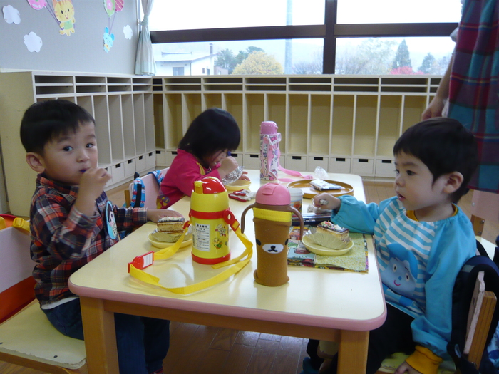 10月2回目のちびっこランドは誕生会に参加しました!幼稚園のお兄さんお姉さん達と一緒に誕生日のお友達をお祝いしたり、人形劇を見たりしました。チョコレートケーキはみんな完食し、もぐもぐとお口にクリームをつけながら美味しそうに食べていましたよ☆食後はボーリングをしたり、恐竜の人形で戦いごっこをしたり、おもちゃの携帯電話で遊んだりと思い思いに好きな遊びを楽しんでいました。 | ||