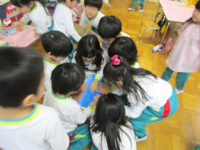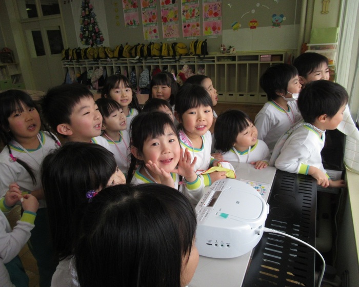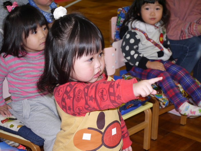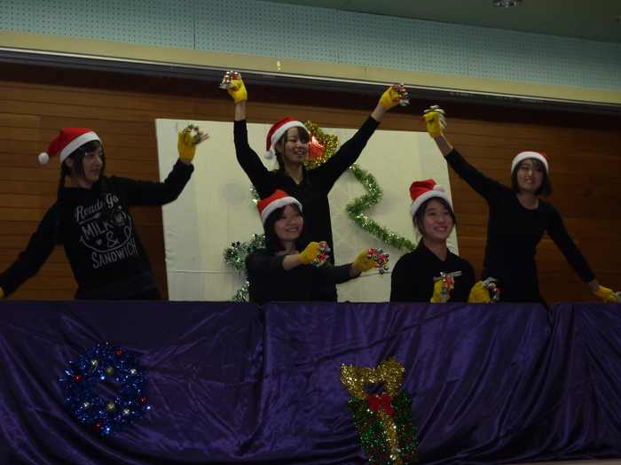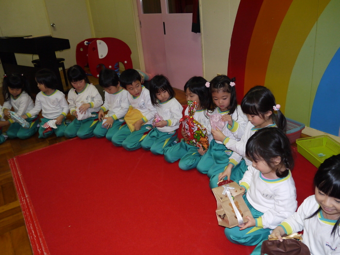 幼稚園、附属保育園リリーの全園児がホールに集まり、少し早めの クリスマス会が開催されました。職員のパントマイムの後にはほんと サンタクロースが登場し、“サンタさんへの質問ボックス”に集まった ものの中からいくつかの質問をしました。サンタさんの登場に大興奮の 子ども達。次の幼稚園に行くサンタさんを、最後まで大きく手を振り ながらお見送りしました。その後には皆でジングルベルのフォーク ダンスをし、お待ちかねのプレゼント交換をし…楽しいクリスマス会に なりました♪ | ||