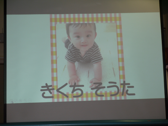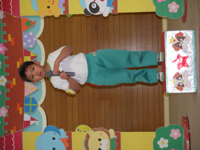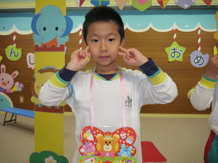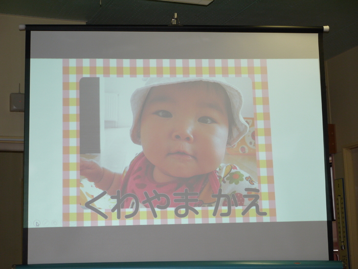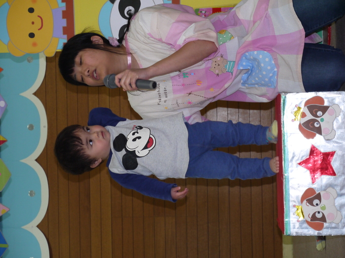 12月は13名のお友達が誕生日を迎えました。クリスマスツリーの 横を通ってステージに向かい、ちょっぴり緊張しながらもニコニコ笑顔 で自己紹介を行いました。「クリスマスプレゼントに欲しいものは?」 の質問に“ケーキ”“プリキュアのスカート”など思い思いに欲しいも のを考え、元気一杯答えていました。 今月のお楽しみはパネルシアター『プレゼント・プレゼント』です。 皆で一緒に歌って踊りながら、プレゼントボックスから出て来る様々な プレゼントを見て楽しみました。 お部屋に戻ってからはチョコレートケーキをパクリ!甘くて美味しい ケーキに大満足の表情を浮かべていました。 | ||