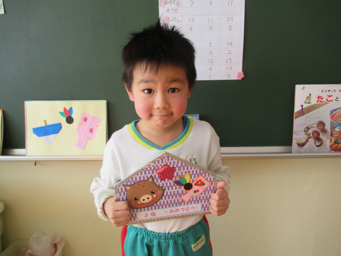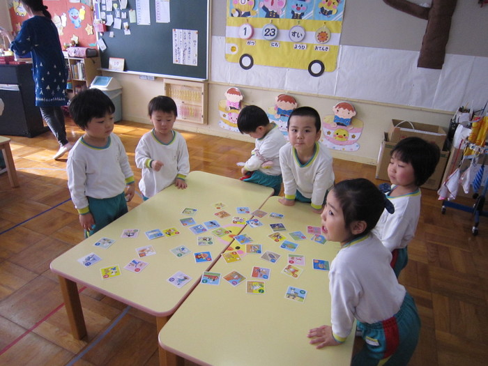23日(水)にカルタ会が開催されました! 年中少組は各クラスで、年長組は合同でホールにて行いました。 始まる前は「楽しみだね~!」とニコニコワクワクしていた子ども達。 読み手の先生が読み札を読み始めると、真剣な顔つきで絵札を探し、 「はい!」と素早い手つきでどんどん取っていきました。 12月に行われたクリスマス会で、サンタさんから頂いたプレゼントの中に 学年ごと種類の違う『カルタ』があり、それを使用して毎年行われているので、 冬休み中に家族で練習してきた子がほとんどでした。 練習の有無によって個人差は見られましたが、どの子もとっても楽しそうでした。 また、中には読み札の言葉を暗記している子もおり、子どもたちの休み中の努力が伺えました。 みんなが張り切っていた真剣勝負! のカルタ会の様子をちょっぴりご紹介します! | ||