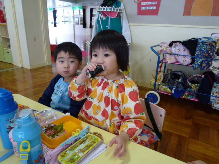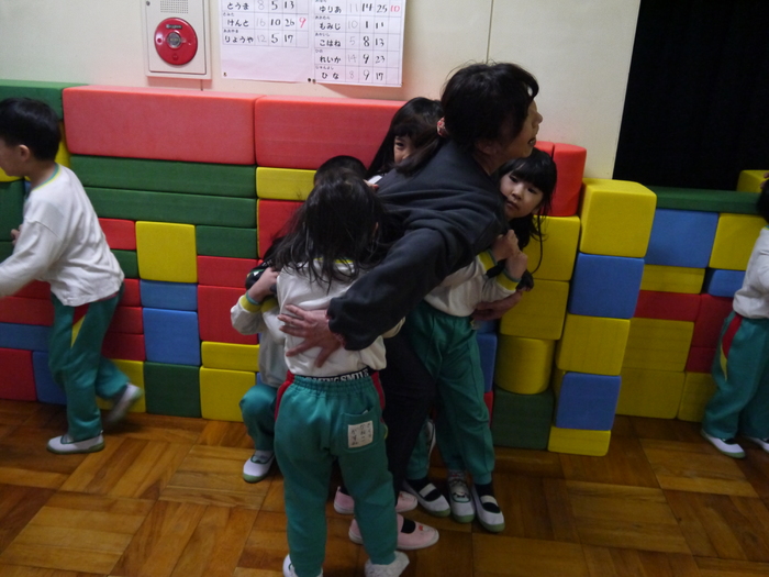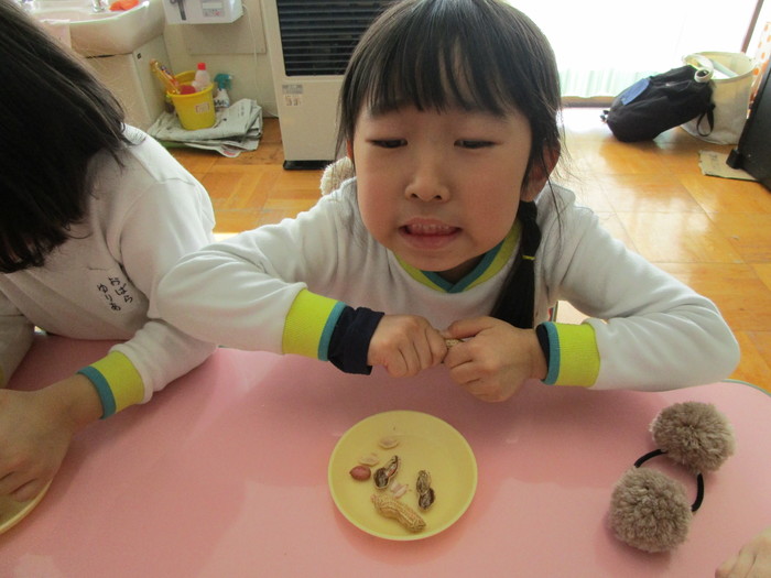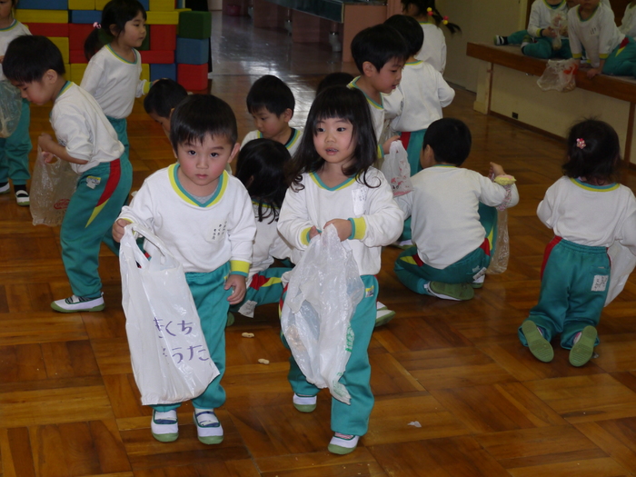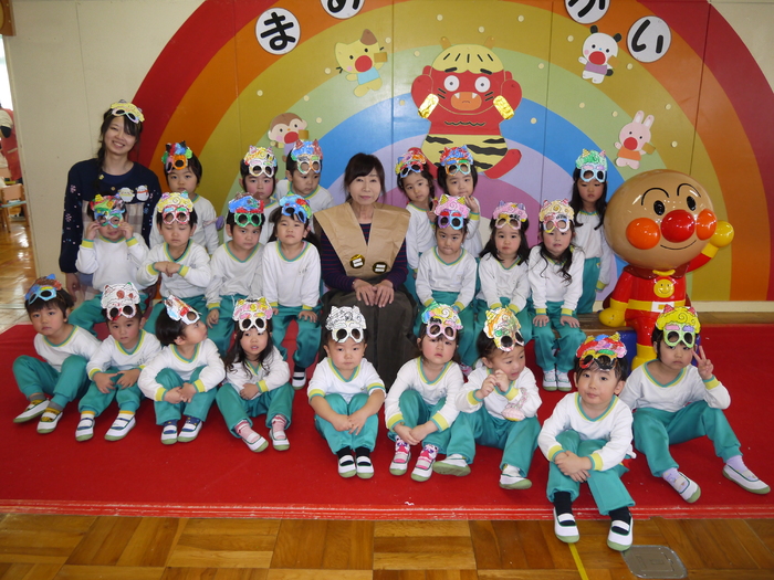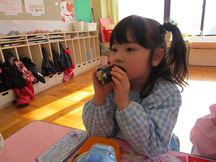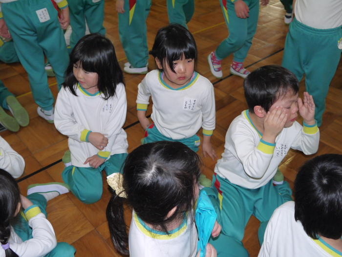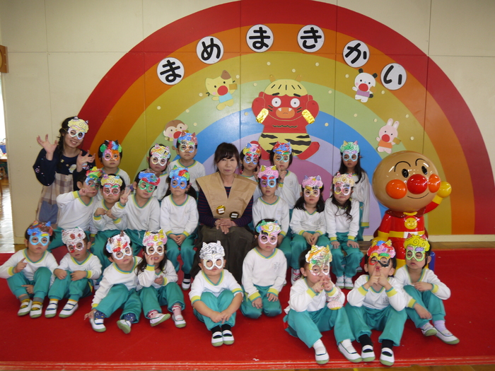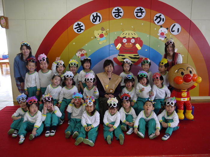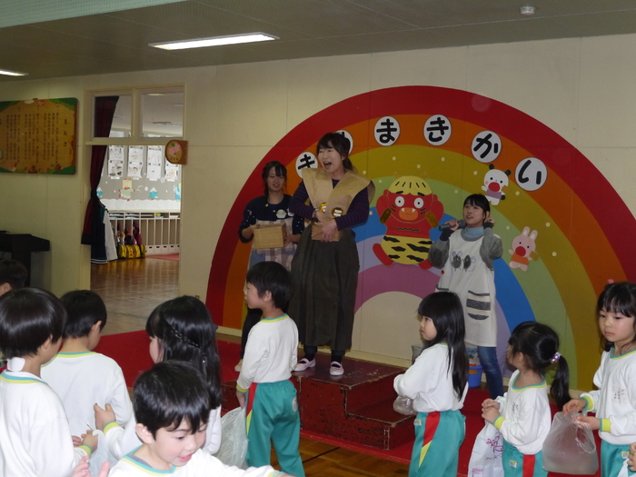 今年の豆まき会も朝からソワソワしていた子ども達。「先生、鬼来るのかな?」「鬼なんか怖くないよ!」「豆沢山拾うんだ!」と楽しみにしている子や少々不安そうにしている子などの姿が見られました。 ホールに集まり、節分についての話しを聞いて、みんなで「まめまき」の歌を元気に歌っている途中で…「ウォー!!」と鬼が登場!!びっくりして必死で逃げる子や怖すぎてその場にしゃがみ込み号泣する子など様々な様子が見られました。 ”福の神”の園長先生が「鬼は外!」「福は内!」と特別なパワーが込められている豆を投げると、鬼は弱りながら鬼ヶ島へ帰っていきました。 最後は、みんなで豆を拾い、各クラスに戻り、自分の歳の数だけ豆を食べ、お昼には恵方巻をいただきました。 それぞれに思い出に残る豆まき会となったことでしょう♪ | ||