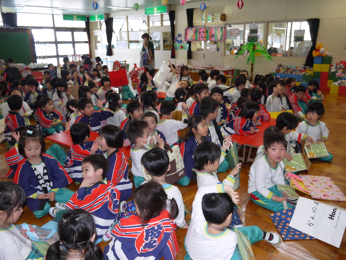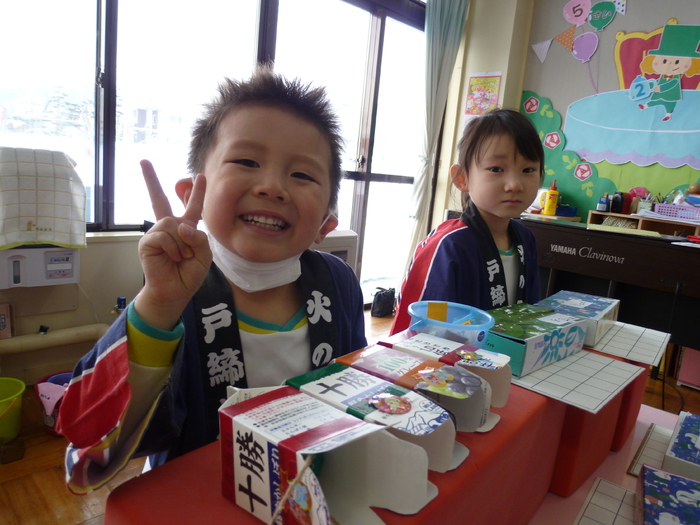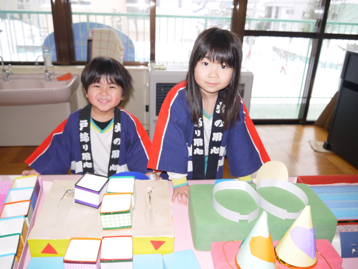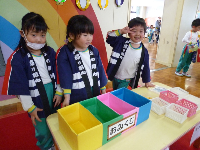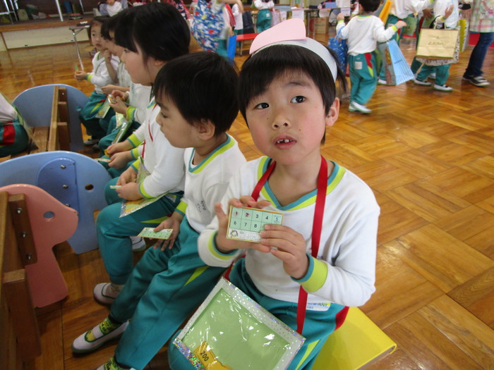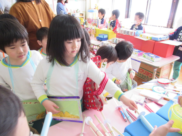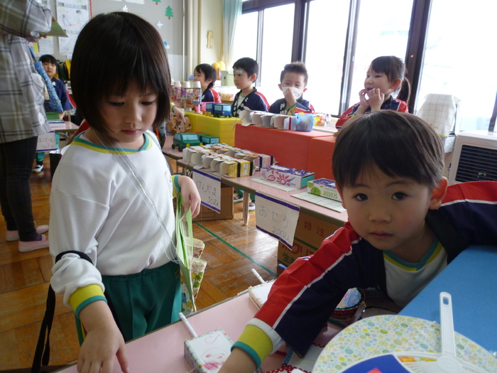 2月21日(木)、22日(金)にお店屋さんごっこを行いました。 「お父さんに、ビール買ってあげるんだ!」「お母さんに、指輪プレゼントしてあげるの!」「ぼく、ラーメン屋さんなんだ!」とお店屋さんごっこを楽しみにしていた様子の子ども達。 売り手と買い手に分かれ、お店屋さんになった子どもは、元気いっぱい大きな声で「いらっしゃいませ~!」と張り切っていました。中には、汗をかきながら売っている子もいましたよ。お買い物を楽しんだ子も「見て!こんなに買っちゃった!」とニコニコ笑顔でした。お店屋さんごっご2日とも大盛り上がりとなり、子ども達の楽しい思い出の1ページがまた増えたことと思います。 | ||