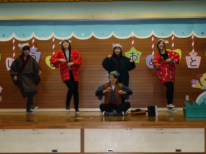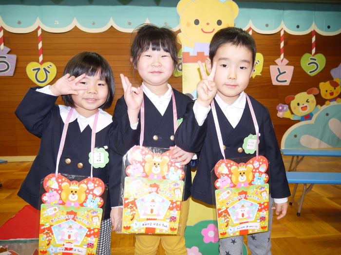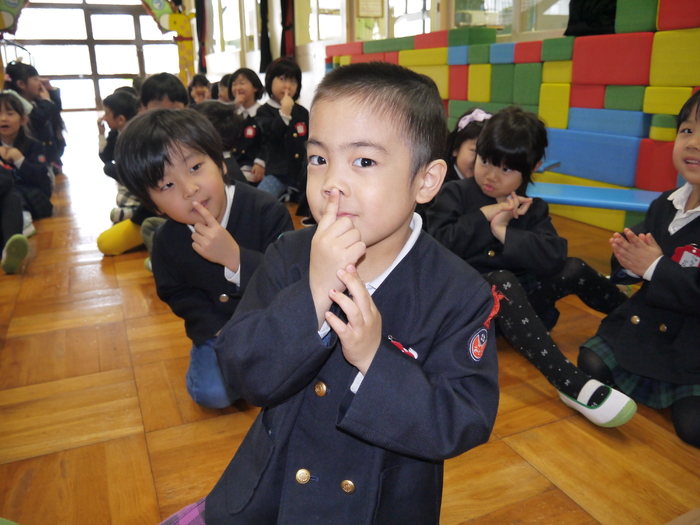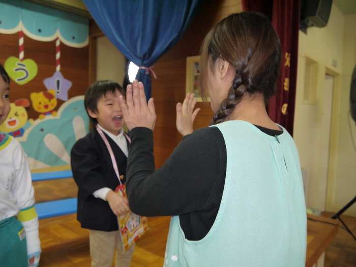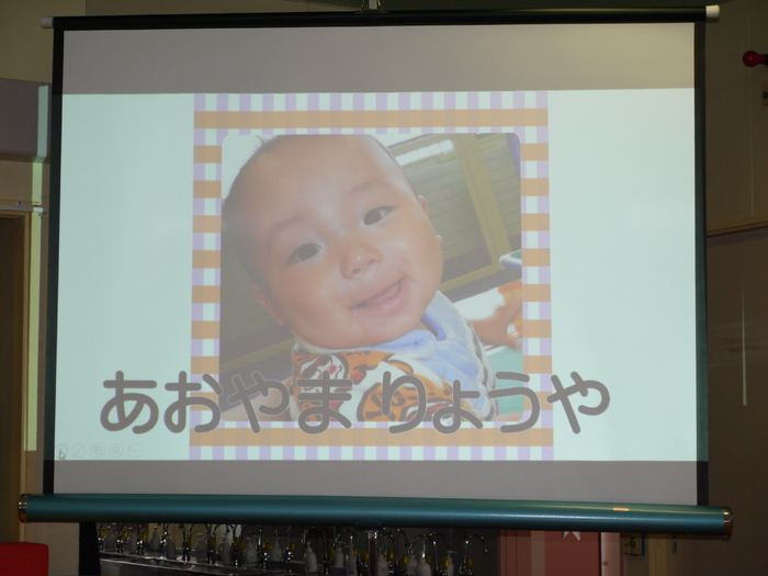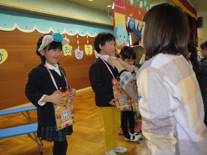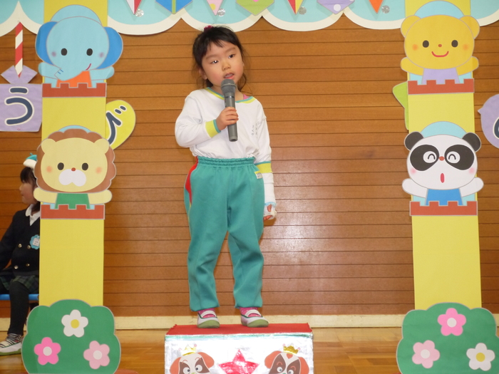 3月14日(木)に3月の誕生会が行われました! 今月の誕生者は11名、ちょっぴり緊張している様子も見られましたが、 自分の赤ちゃんの頃の写真を見て、「はい!」と自信を持って手を挙げる子や 自分の写真か分からず首を傾げている子もいました(*^▽^*) みんな、マイクを持って堂々と発表してくれましたよ! 今の顔と赤ちゃんの頃の写真を見比べることで、 面影が残っている子や今とあんまり変わらない子等、 その子それぞれの成長をひしひしと感じられた誕生会となりました。 さて、今年度最後の誕生会のお楽しみは…職員劇「おむすびころりん」でした! おむすびころりんすっとんとん♪という軽快なリズムが耳に残る劇。 終了後には、子ども達から「楽しかったー!」の声を聞くことができ、 私たちもとっても嬉しい気持ちになりました(^^♪ 次年度も子ども達に喜んで貰える誕生会にしていきたいと思います! | ||