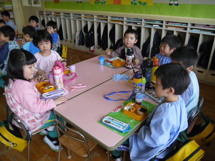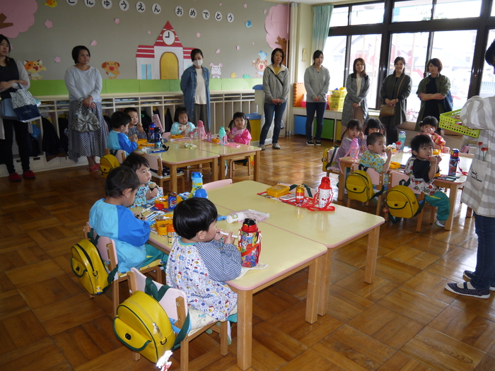 平成も残り9日…。4月22日月曜日、新入園児の保護者を対象に給食参観日が実施されました。入園間もない子ども達には、初めての参観日という環境に戸惑ってしまう子も見られましたが子ども達は、給食のおにぎりやから揚げを頬張っていました。まだまだ、初めて食べるものやご家庭で食べ慣れていなかったりなど…好き嫌いが目立ちますがみんなで同じものを食べることで少しずつ改善され、一人ひとりが食べる喜びや楽しさをこの給食から感じられることを期待しています。 本日の参観の様子をご紹介します。 | ||
