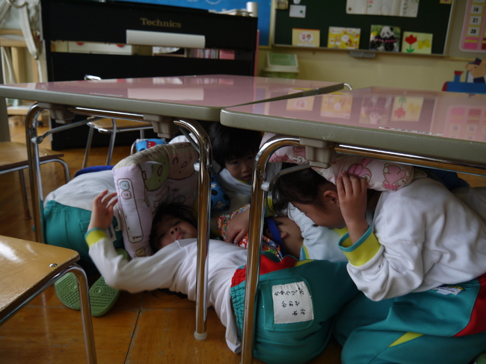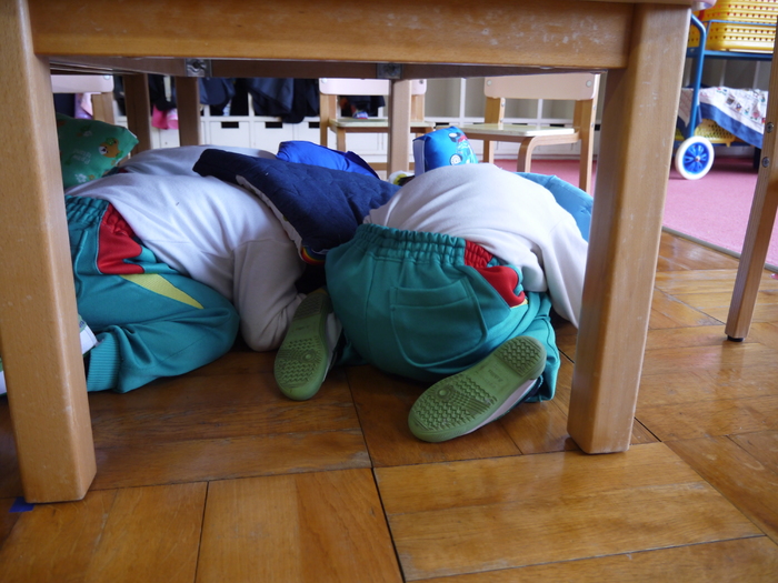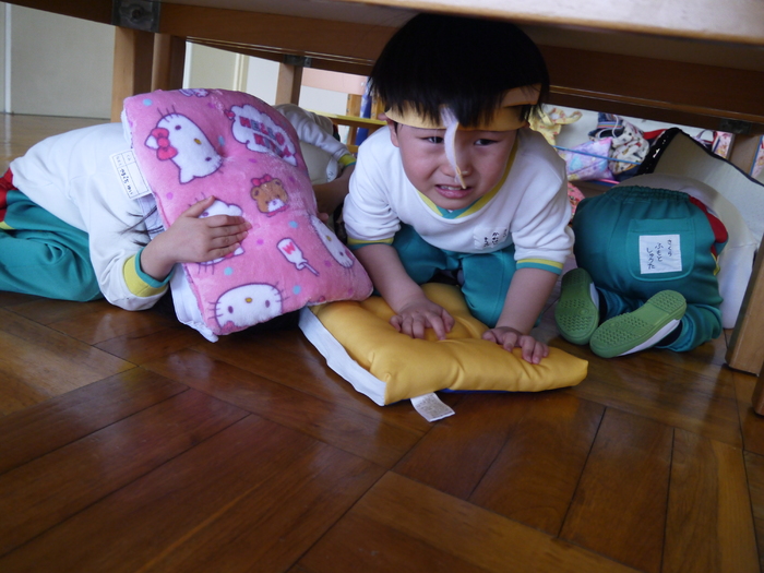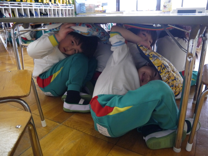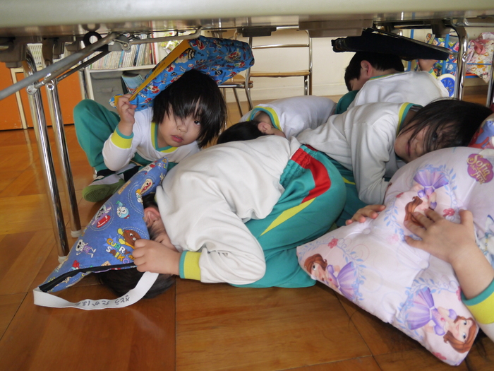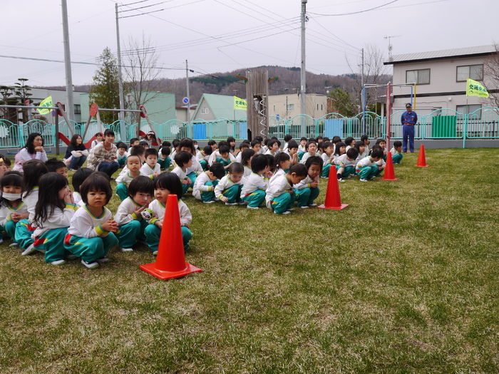 4月23日(火)春の避難訓練を実施しました。図書室からの出火設定で訓練開始!!『火事です!幼稚園の図書室から出火です。クラスの先生のお話をよく聞いて、園庭に避難して下さい。』のアナウンス後に各クラスから子ども達が先生の後について出てきました!どの子も真剣な表情で口には、ハンカチや手をあて煙を吸わないように逃げていました。全園児が園庭に避難したタイムは、1分57秒4。毎年、初めての避難訓練では 2分を超えていたのですが今年は、とてもスピーディーかつ安全に避難することができました。芦別市の消防団長を務めている理事長から水消火器の使い方をご指導いただき先生達が実演し、本日の避難訓練は終了。抜き打ちで地震の際の避難練習も行いました。自分の座布団で頭を守り、机の下に友達を身を寄せ合って避難していた子ども達でした。各学年ごとに火災や防災に関するビデオも視聴しました。 | ||