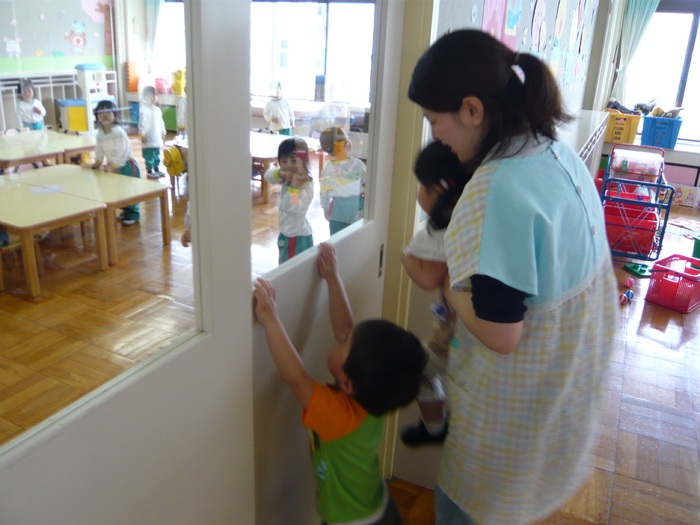 お隣のひまわり組(年少)から元気な歌声が聞こえる…!! と、コッソリチラ見♡(笑) | ||