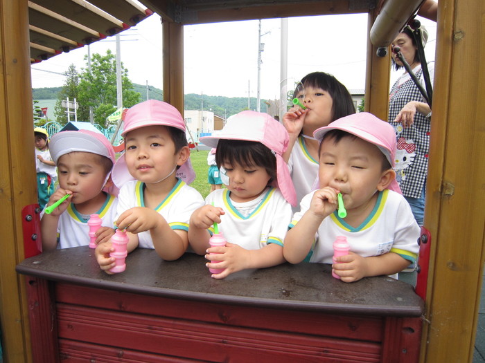 6月に入り、園庭に出てのシャボン玉遊びが始まりました! たくさん舞っているシャボン玉を追いかけ触ってみたり、ゆっくり慎重に吹いて大きなシャボン玉を作ってみたり…それぞれがニコニコ笑顔で楽しんでいました♪今回は、そんな子ども達の様子を少しだけご紹介したいと思います!。 | ||