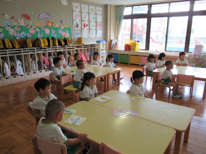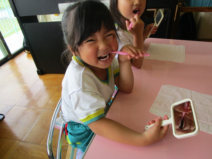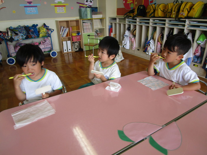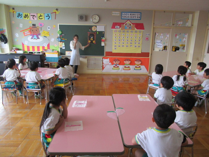 今回も歯科衛生士の三谷さん・担当保健師の村上さんをお招きして第2回目の歯磨き指導が行われました。今回のクラスは、すずらん・さくら・ひまわりの3クラス。それぞれの学年に合った教材を用いて、わかりやすく歯磨きの大切さについて学ぶことができました。その時の様子を、少しづつご紹介します(*^^*) | ||