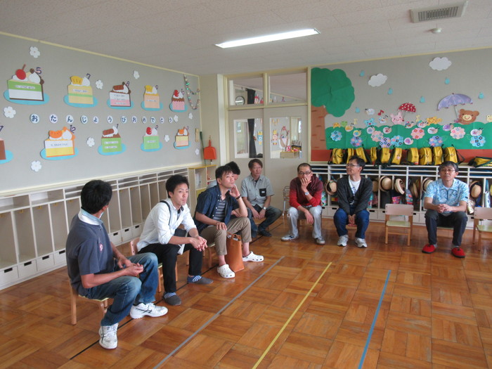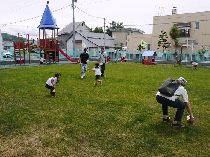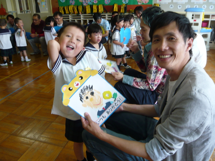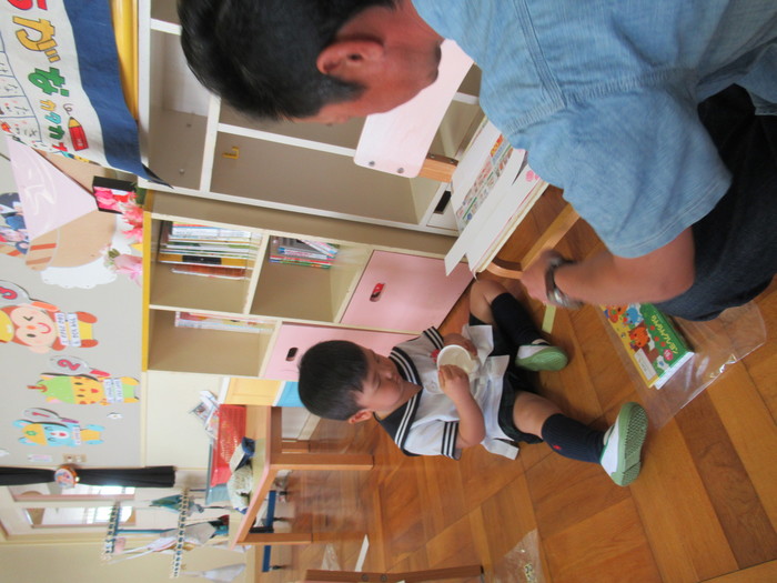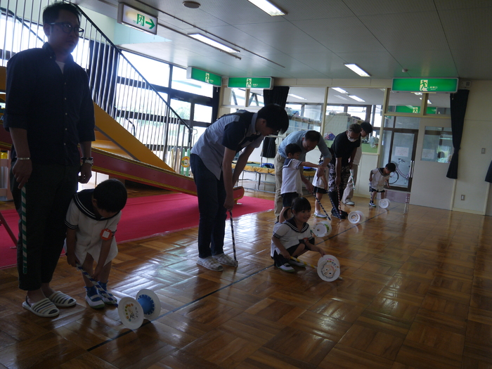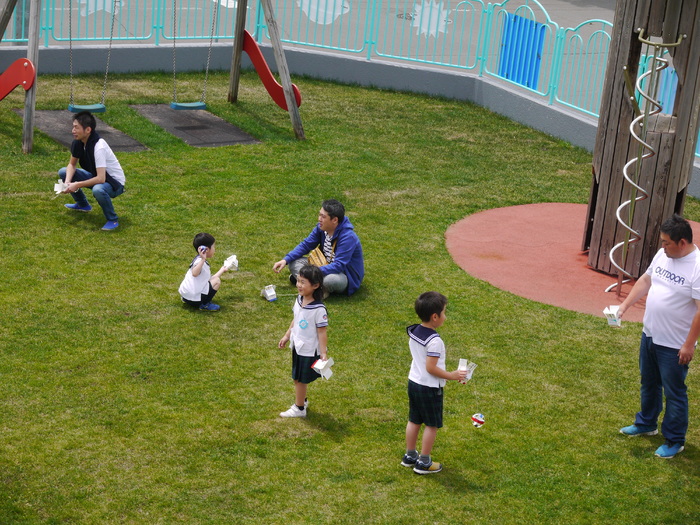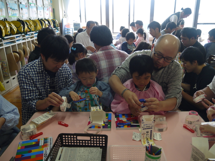 朝から、お父さんと一緒に笑顔で登園をしてきた子ども達。いつもと少し違う雰囲気に緊張をしている子、お家の人と一緒に居ることにうきうきしている子など、様々な姿がありました。 クラスではお家の人と一緒に手作りおもちゃを作って遊んだり、ゲームをしたり…楽しい時間を過ごした後は、手作りプレゼントと気持ちのこもった歌の贈り物です。「いつもありがとう!」「お仕事頑張ってくれてありがとう!」普段の感謝の気持ちをしっかり伝えられたかな?笑顔に溢れた、楽しい参観日となりました! | ||