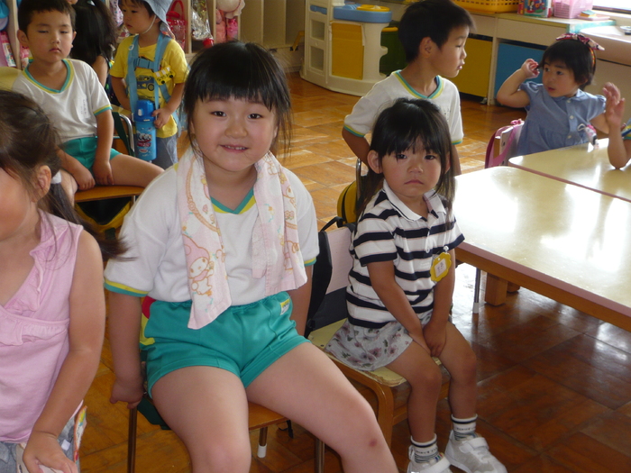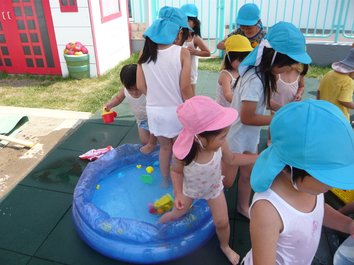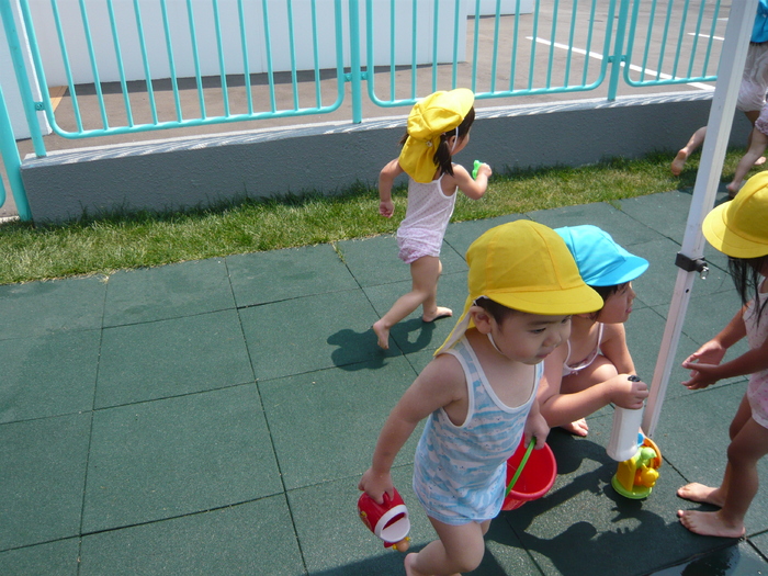 7月を迎えても、肌寒い日が続いていましたが今週に入りギラギラとした太陽が顔を出し、やっと夏到来です! さて、7月のちびっこランド(子ども子育て支援事業)の1回目が10日(水)に開催されました。今回は〝水遊び〟を園庭で楽しみました。年長組のお兄さん、お姉さん達が今回もお世話をしてくれました。初めは、泣いていた子も朝のご挨拶をしたり、出席カードにシールを貼っているうちに涙もとまりニコニコ笑顔に変わっていきました。おもいっきりはしゃぎながら、水遊びを楽しんでいる子ども達の様子をご紹介します。 | ||