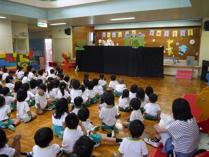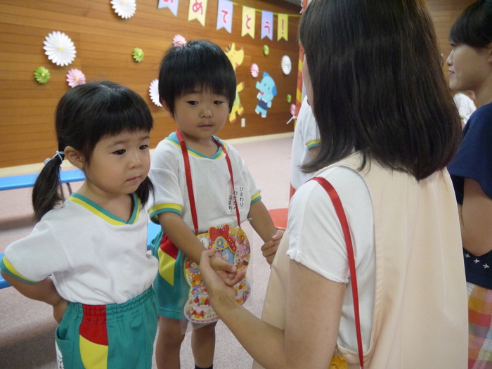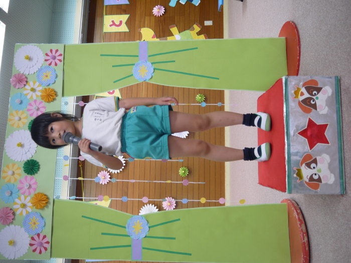 7月の誕生会! 階段から元気に入場してきた8名のお友達。クラスのお友達からたくさんの声援を受け、とっても嬉しそうでした。大きくなったら・・・?の質問には『ピカチュウになりたい』『けいさつかん』『サッカー選手!』と個々に夢を発表してくれました。 今月のケーキは、クリームケーキ★みんなで美味しくいただきました。 | ||