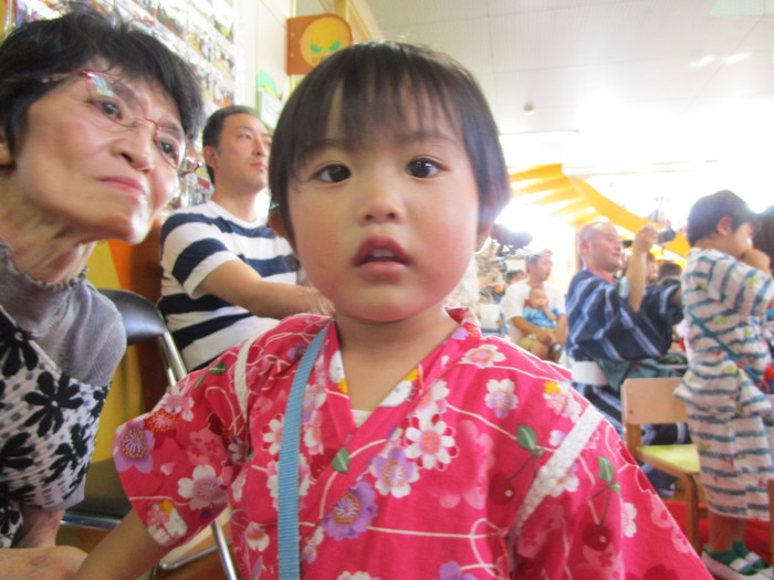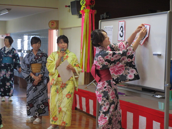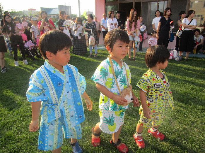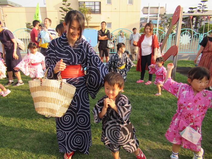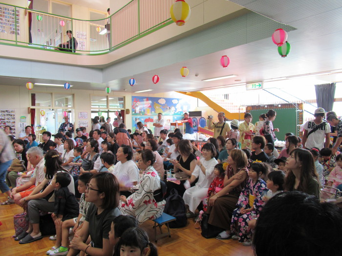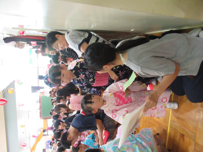 8月3日(土)にみどり幼稚園にて、浴衣のつどいが行われました♪ 夏休み中にもかかわらず、ご家族、ご兄弟、祖父母…沢山の方がご参加して下さいました! 子ども達の浴衣・甚平姿はもちろんかわいかったのですが、 おうちの方や遊びに来てくれたお姉さん達の浴衣姿もとっても素敵でした♪ 各クラスに短冊を飾り、日常写真を見ながら親子での会話も弾んでいました。 お楽しみでは、今年はサマージャンボを行いました。また、影絵のいしとほし、山太さんにお越しいただき、楽しいお話やクイズなどを披露して頂きました。影を使ってこんな風に演じることが出来るんだとすごく引き込まれる影絵のショーで大人も子供も楽しむことができました(*^_^*) その後は園庭にてみんなで盆踊り、千人踊り、花火を楽しみ…最後にサマージャンボの当選発表!! ドキドキの瞬間でしたね!見事当選した親子はとっても嬉しそうでした★ みなさまのおかげでゆかたの集いは大盛り上がりでした!沢山のご参加、ご協力ありがとうございました♪ | ||