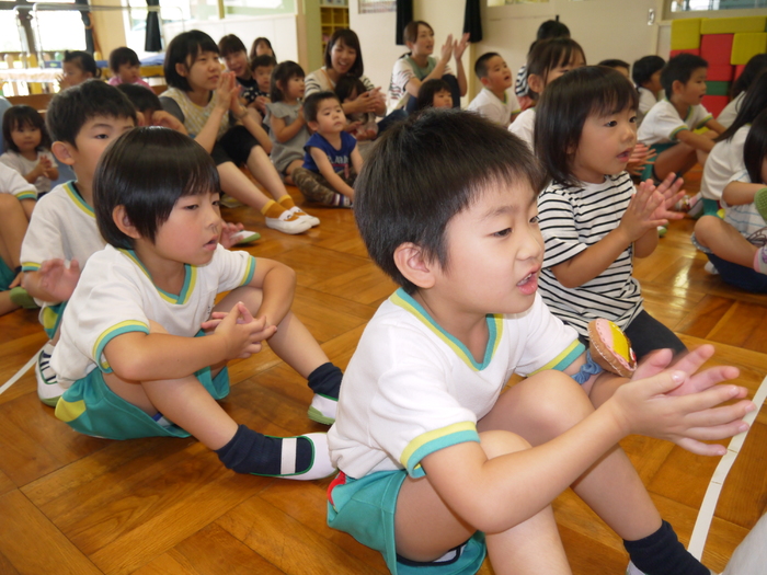 8月の誕生会が行われました! 今月の誕生者は多く、 17人でした(*^▽^*) 今月はちびっこランドのお友達も一緒に参加し、みんなで誕生者をお祝いしました。 お祝いされるお友達も、お祝いするお友達も、みんなとっても嬉しそうでした♪ お誕生日、おめでとうございます!(^_-)-☆ | ||