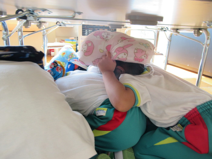 今年度、秋の避難訓練が2日(水)実施されました。春の訓練での経験をしっかり覚えていた子ども達は、非常ベル後のアナウンスも落ち着いて聞き クラスの先生の指示に従い素早く園庭に逃げていました。 煙を吸わないよう、口元をハンカチや手で覆いながら避難していた子ども達。園庭に集合後〝どうして口をハンカチや手で覆って逃げるのか…?〟との質問にも〝煙を吸わないように!!〟とすぐに応えていました。 春の訓練の避難タイムは、1分57秒4でしたが今回、秋の訓練の避難タイムは、1分23秒9と約30秒も早く避難できました。 園内に戻った後は、地震を想定した訓練も実施し 〝もしも・・・〟に備えて 机の下に座布団を被って隠れていました。子ども達が真剣に訓練している様子をご紹介します。 | ||