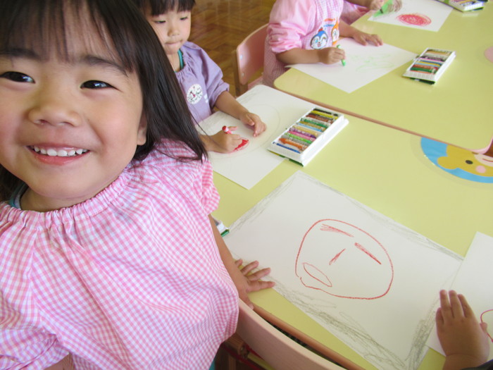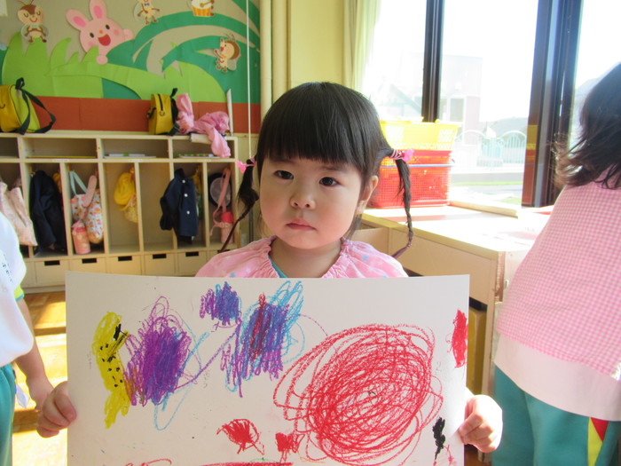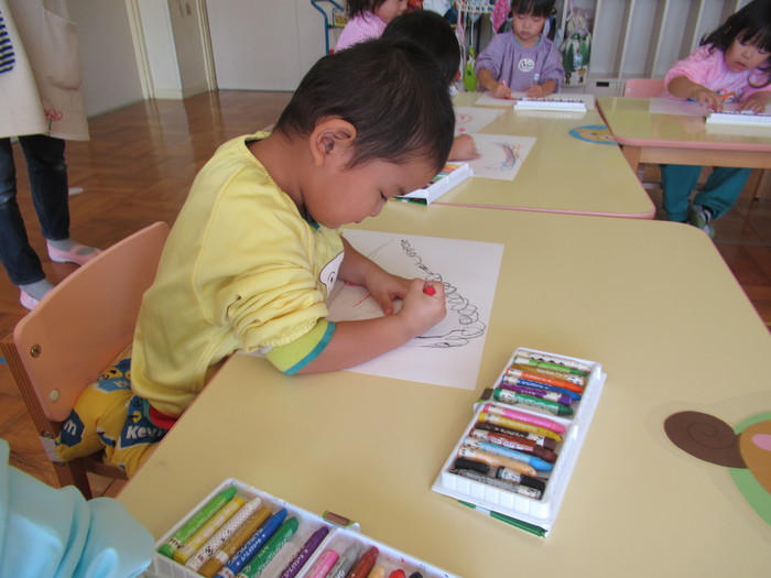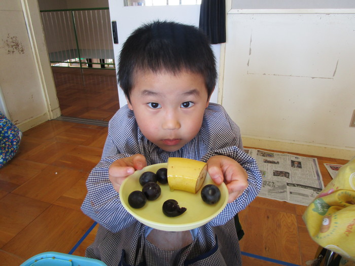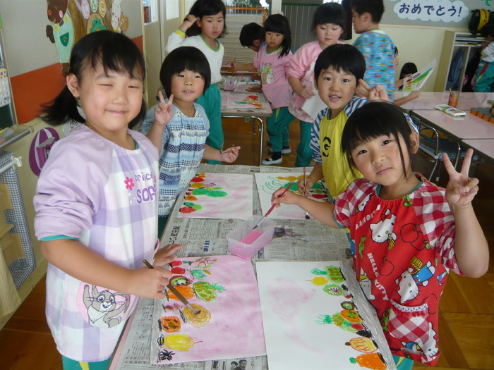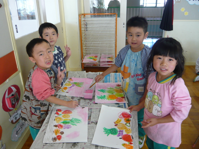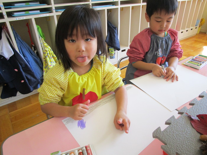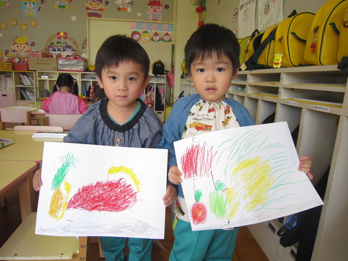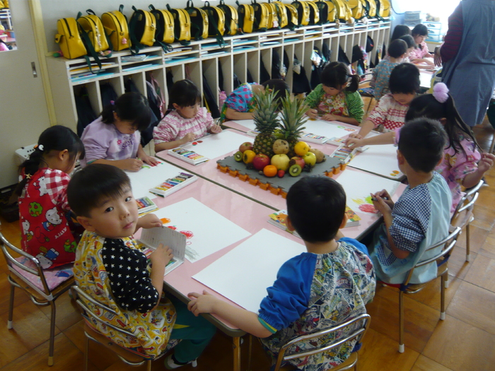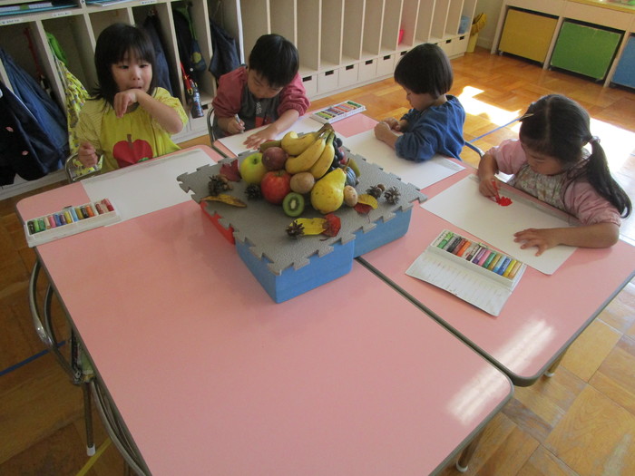 食欲の秋にちなんで身近な秋の食材や果物、自然物(どんぐり、落ち葉、まつぼっくり等)に関心を持ちながら絵を描く写生会。普段、見慣れているものの特徴、色の変化などを改めて観察をし気付きながら個々に表現することをねらいとし毎年、実施しています。食材と果物が重ねり合っている細かな部分もしっかり表現している子や一生懸命、特徴を捉えようとしながら描いている子など様々でしたが子ども達の芸術が溢れた作品ばかりです。 写生会に向けてご家庭から集めた果物は、何日間に分けて クラスみんなで美味しくいただきま~~~す!! | ||