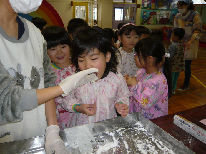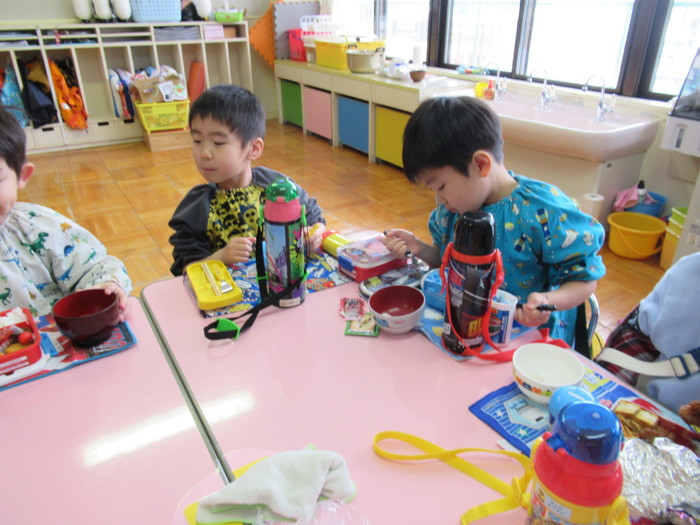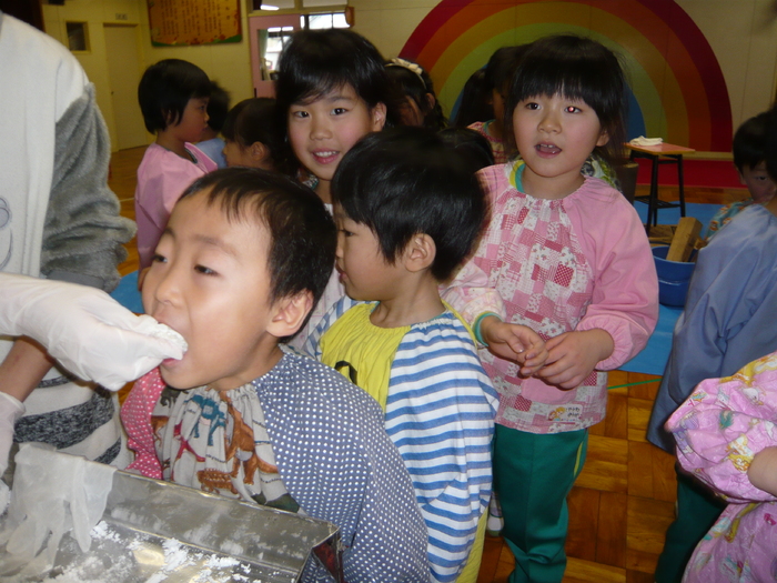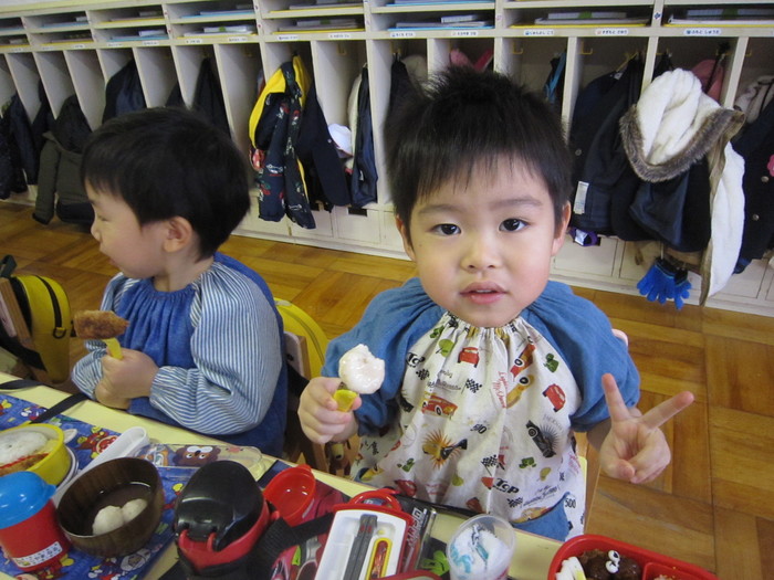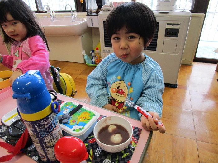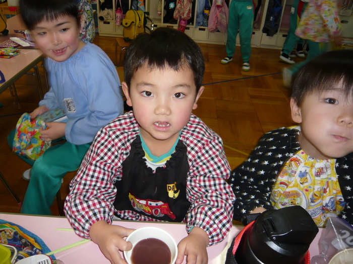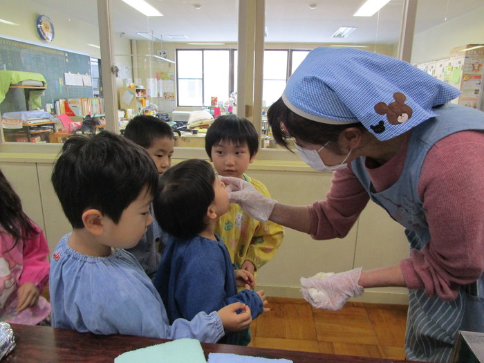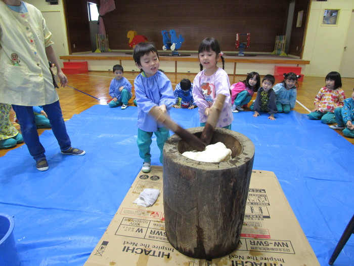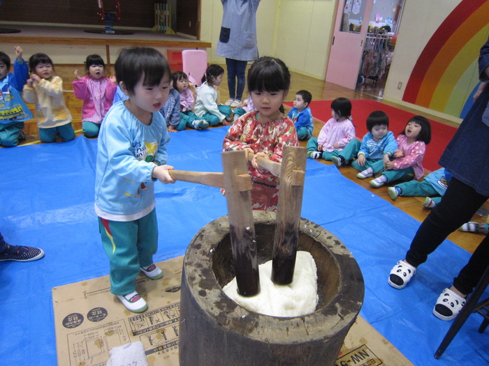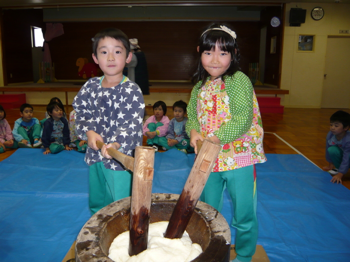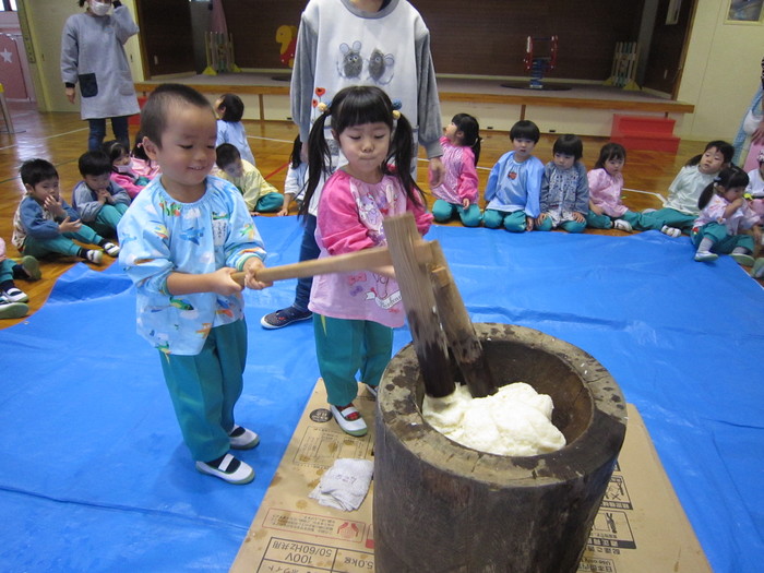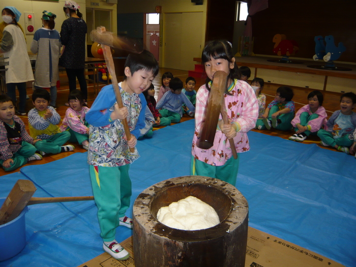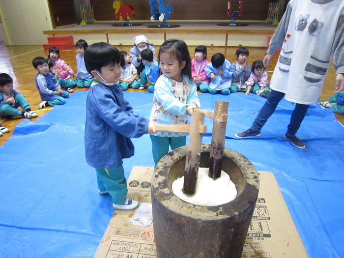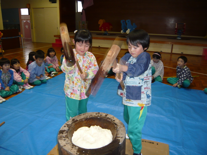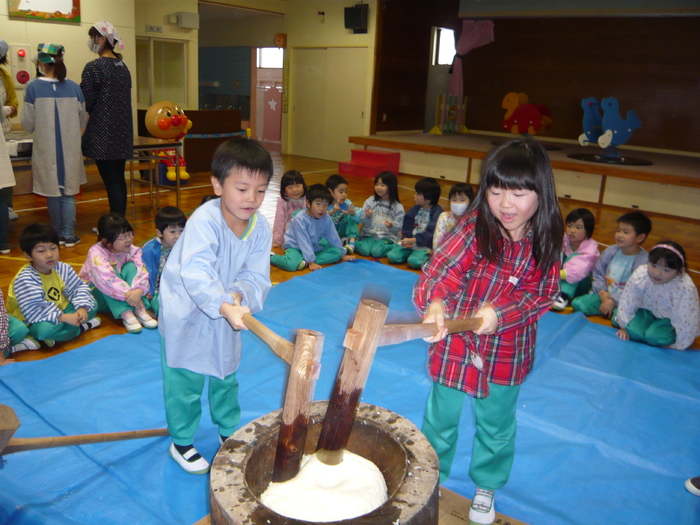冬を迎え、温かいマフラーや手袋をして登園する姿が多く見られるようになったこの頃。幼稚園では子ども達も楽しみにしていたもちつき会が開催されました。「よいしょ!よいしょ!」の掛け声とともに各学年ごとに餅をつき、つきたてのお餅をパクリ!「あったかいね」「美味しいね」とたくさんの笑顔が見られました。ついたお餅は甘~いお汁粉にして、お弁当と一緒に頂きました。美味しく楽しい一日でした♪ | ||