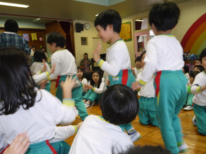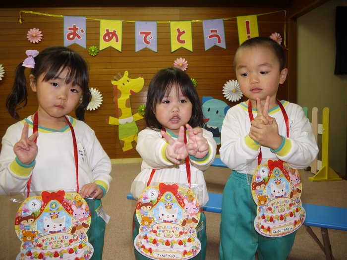 1月のお誕生会が31日(金)に行われました。附属保育園リリーそして、ちびっこランドのお友達も一緒に参加。1月生まれの7名のお友達は、たくさんの拍手の中 元気に入場しました。ステージ上では、自分の名前・何歳になったかを発表。大きくなったら…の質問では〝うさぎ〟〝モデル〟〝仮面ライダー〟などなど。担任の先生からのメッセージや誕生カードをプレゼントでいただきニッコニコの子ども達でした。お楽しみ会では、スライド〝おおかみと7匹の子やぎ〟を観ました。 | ||