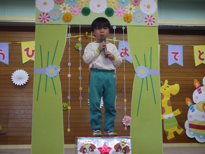 2月26日に2月の誕生会を行いました。 9名の誕生者をみんなでお祝いしました!! 緊張しつつも、マイクを持ってしっかり自己紹介する…そんな姿に成長を感じますね。 今月のお楽しみはペープサート!!きつねとたぬきのお話でした(*^▽^*) それでは、誕生会の様子をご紹介します★ | ||