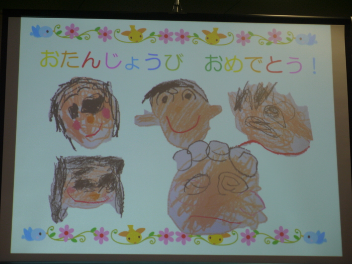 今年度初めての〝誕生会〟★附属保育園リリーの可愛いお友達も幼稚園に来て、一緒に参加。 4月生まれのお友達は、ちょっぴり少ない5名でした。(お休みをしている子もいました) みんなの盛大な⁈ 拍手の中、元気に入場!ステージ上では、クラス・名前・何歳になったかを自分でマイクを持ち発表。スクリーンには、自分で描いた自画像と事前にクラスの先生からの質問を自己紹介形式で司会の先生が紹介しました。スクリーンに映った自画像は、特徴を捉えていたり まだ、慣れない絵画製作を一生懸命頑張った等、個性豊かな子ども達の作品がとってもかわいく微笑ましかったです。最後の大きくなったら…の質問は、再びマイクを誕生者に渡し 発表!みんな個々に大きくなったらなりたいものをしっかり発表してくれました。 今月のお楽しみは、みんなが大好き〝アンパンマンのDVD〟を観て、会は終了。クラスに戻り、次のお楽しみ★今月は〝チョコケーキ〟でした。 嬉しそうにモグモグとケーキを頬張っていた子ども達でした。ケーキは、クリームケーキとチョコケーキが2種類ありますので来月も楽しみですね☻ | ||