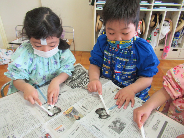 歯科衛生士の三谷さんが幼稚園に来園し、虫歯にならないための正しい歯磨きの仕方を指導してくれました。紙芝居や模型を使ってわかりやすくお話をしてもらい、話に聞き入っていた子ども達。年長さんは一人ひとりに教材を用意してもらい、歯ブラシを使って実際に磨いてみて歯磨きの大切さを学びました。今回教えてもらったことを忘れず、毎日しっかり歯磨きをして歯を大切にしていきましょうね! | ||