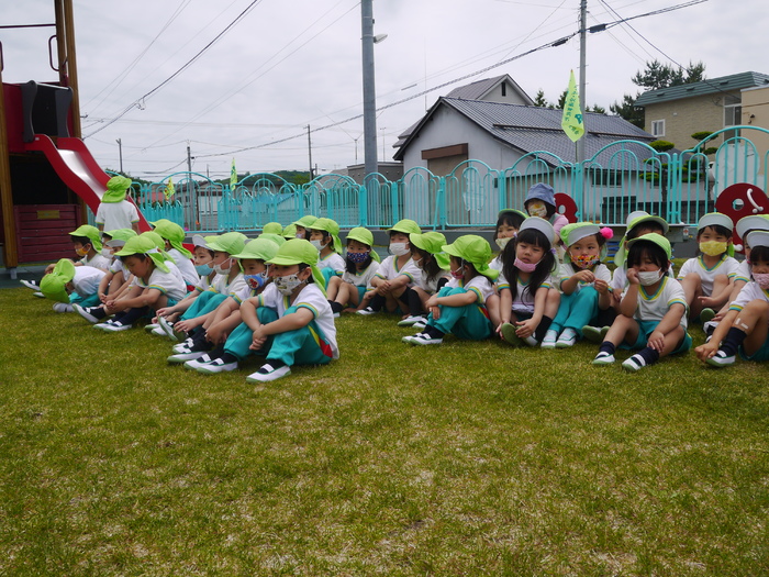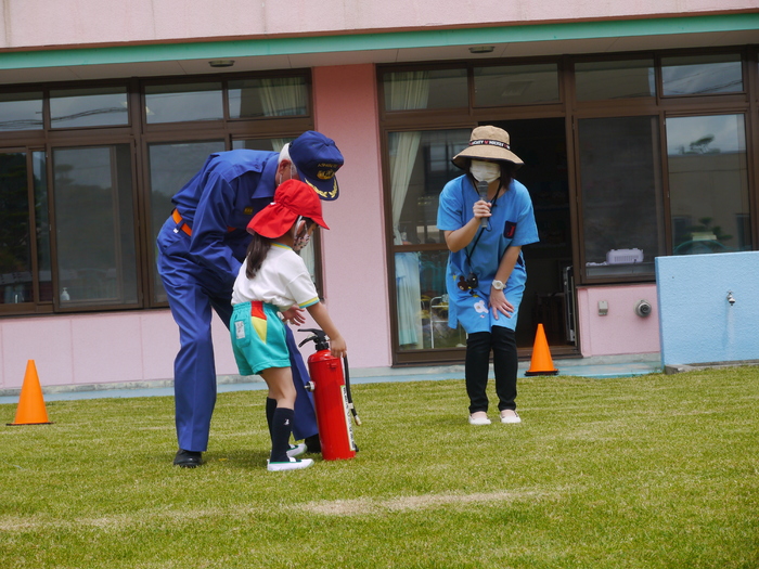 天候やコロナウィルスの影響で順延となっていた、春の避難訓練が実施されました。園内にサイレンが鳴り「図書室が火事です‼」というアナウンスが流れてくると、子ども達はストップゲームをしているかのようにピタッと動作をやめて先生の話を真剣な表情で聞き、園庭へ避難する準備を始めました。煙を吸い込まないように手で口を押さえて、お喋りをせずに急ぎ足で逃げ、全員の避難が終了したタイムは、1分55秒54‼今年度初めての避難訓練でしたが、素早く安全に避難することが出来ました☆芦別市の消防団長を務めている理事長先生から水消火器の正しい使い方を教えてもらい、先生や年長さんが火のパネル目掛けて水を発射!見事命中させてみんなからたくさんの拍手が沸き起こりました。クラスに戻ってから、今度は地震の際の避難練習も行いました。自分の座布団で頭を守り、机の下に潜り込んでいた子ども達。中には驚いて泣き出してしまう子もいましたが、周りの様子を見て避難する姿が見られました。 | ||