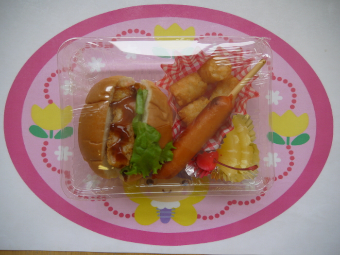 令和2年 6月3日(水) ★ エビカツバーガー ★ 串付ソセージ ★ ハッシュドポテト ★ パイン・チェリー | ||