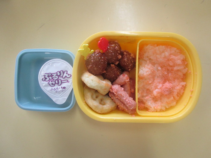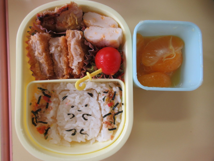 お昼が近づくと雨が勢いよく降りだしていましたが、各クラスからは子どもたちが元気に歌う♪お弁当の歌♪が聞こえてきました。お友達とたくさん遊んで、お腹がペコペコな子ども達☆完食が早くなってきた子や、その日の気分や体調によって残してしまう子もいますが、お家の人が作ってくれた愛情たっぷりのお弁当を食べて、雷の音にちょっぴりドキッとしながら、お昼からもお友達との遊びを楽しんでいました。今日はさくら組・ひまわり組のお弁当をご紹介します♪ | ||