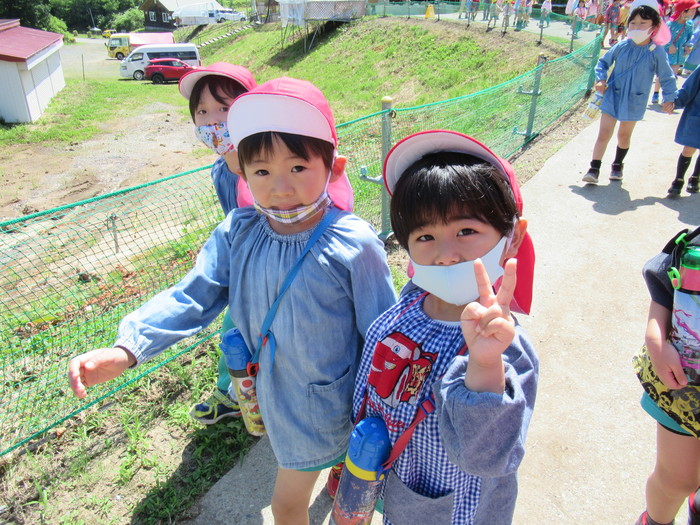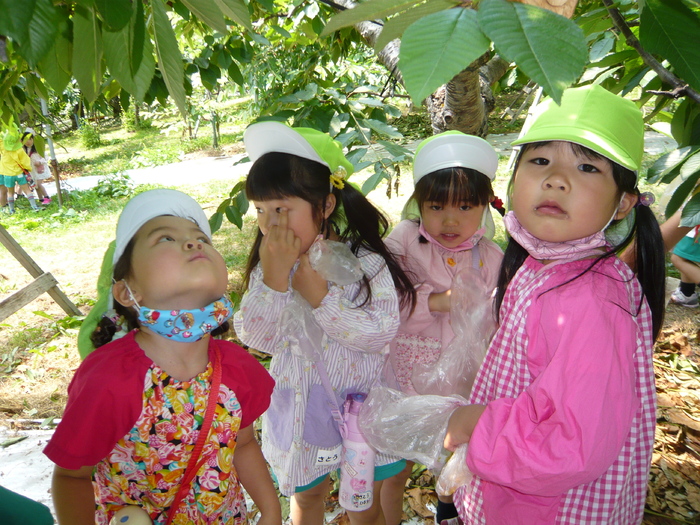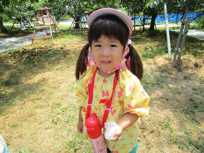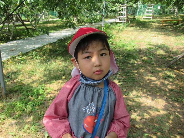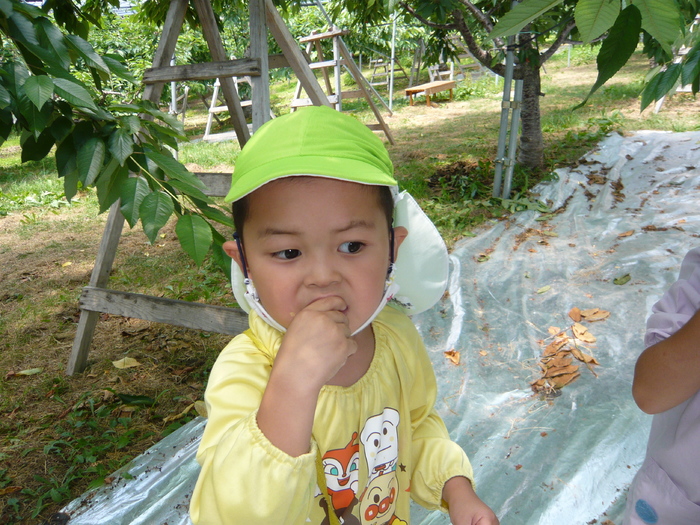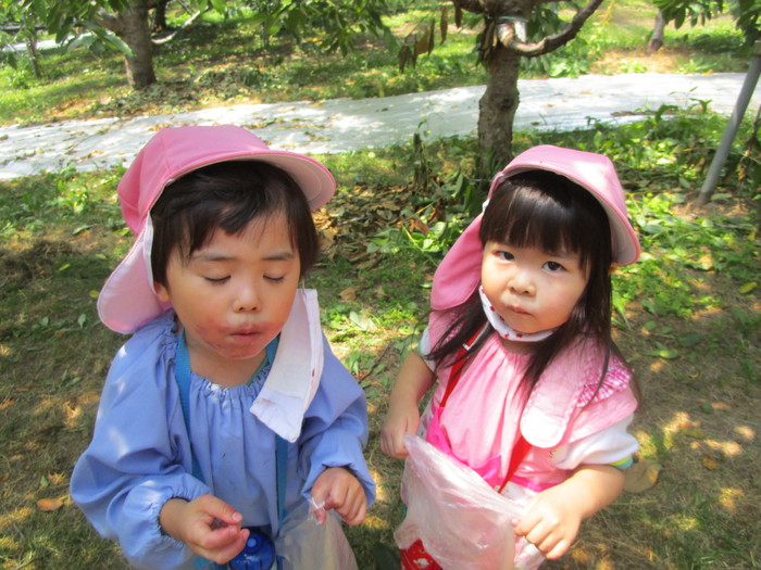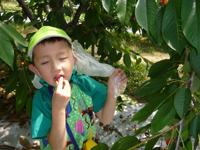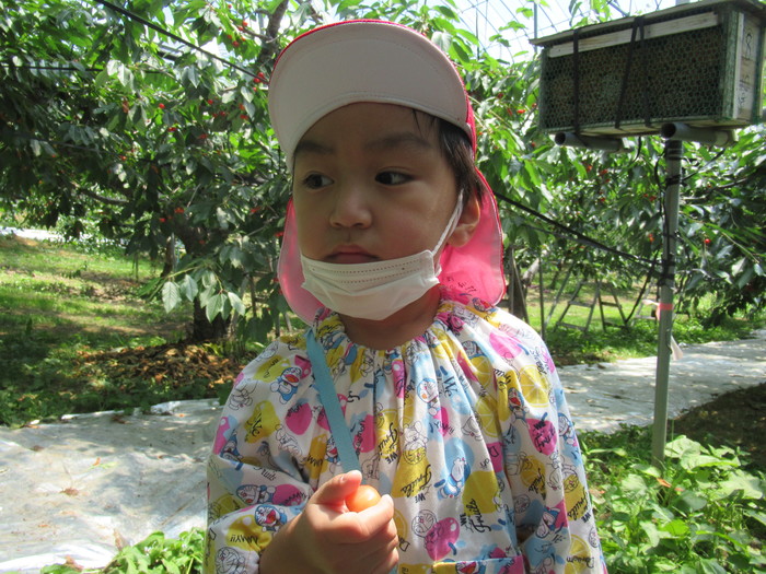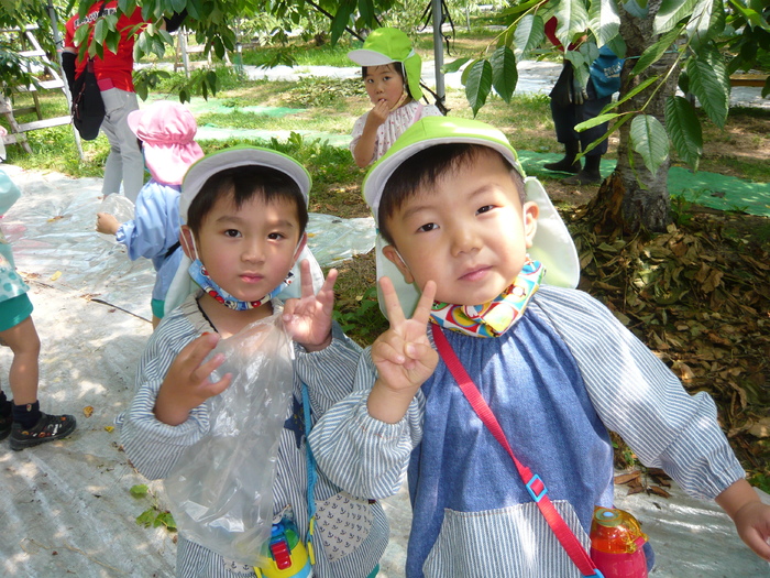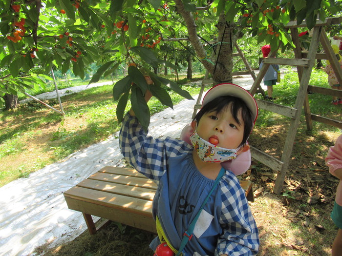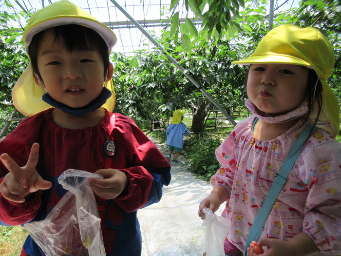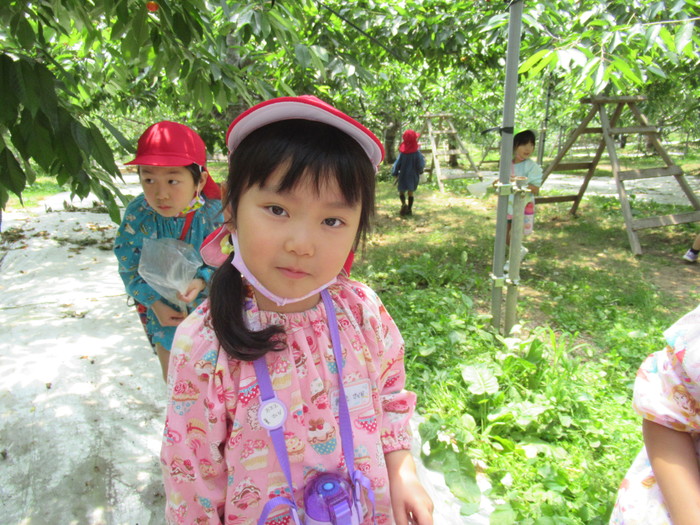 1学期最後の7月17日(金)、子ども達も楽しみにしていた『さくらんぼ狩り』に行ってきました! 新型コロナウイルス感染症の拡大予防のため、1学期の行事が全て中止となりましたが最後の最後に実施できたことは、とても嬉しいことでした。市内にある『大橋さくらんぼ園』へ園バスで出掛けましたが子ども達は、バスに乗った時点でテンションがMAX状態!!お友達との会話も盛り上がり、園バスの中は今までにないくらい賑やかでした。さくらんぼ園に到着し、係員のお姉さんからさくらんぼのもぎ方や種を袋に入れること等の説明を聞き、その後美味しいさくらんぼがいっぱいの山に向かって出発!先生達の『帰るよ~~』の声がかかるまでお腹いっぱい食べていた子ども達でした。もちろん、帰園し昼食後は1階、2階のトイレが満室になりました(;^_^A 美味しいさくらんぼを食べて笑顔いっぱいの子ども達の様子を紹介致します。 | ||